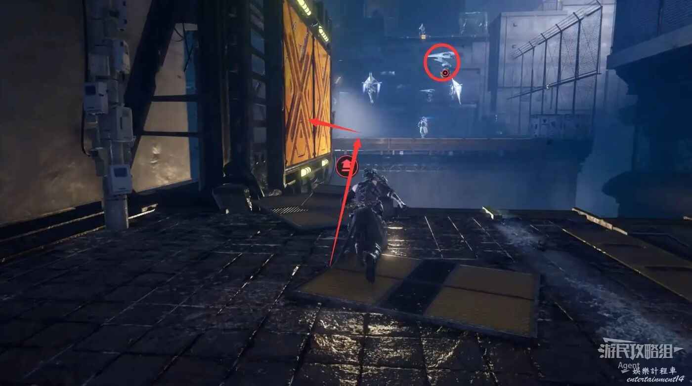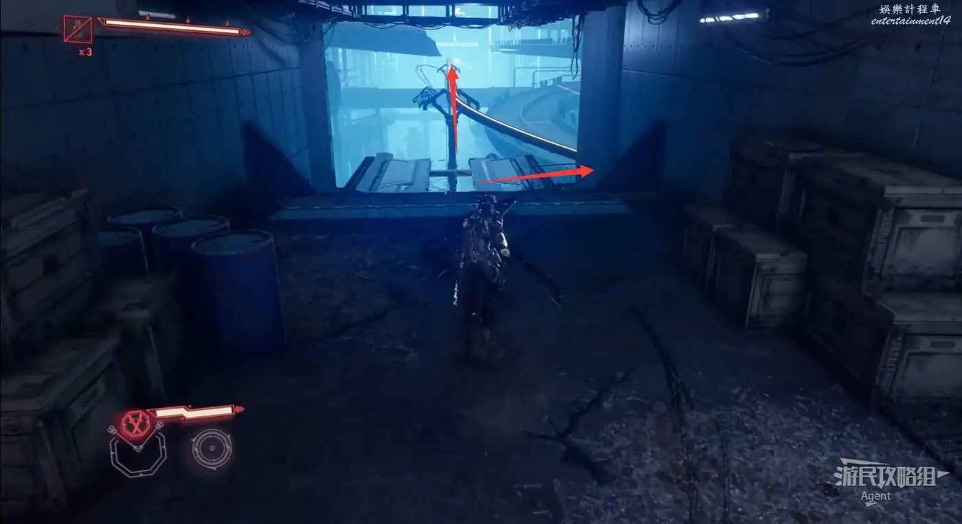 蹬牆跑過來,抓無人機跳上軌道,消滅敵人後大門打開。