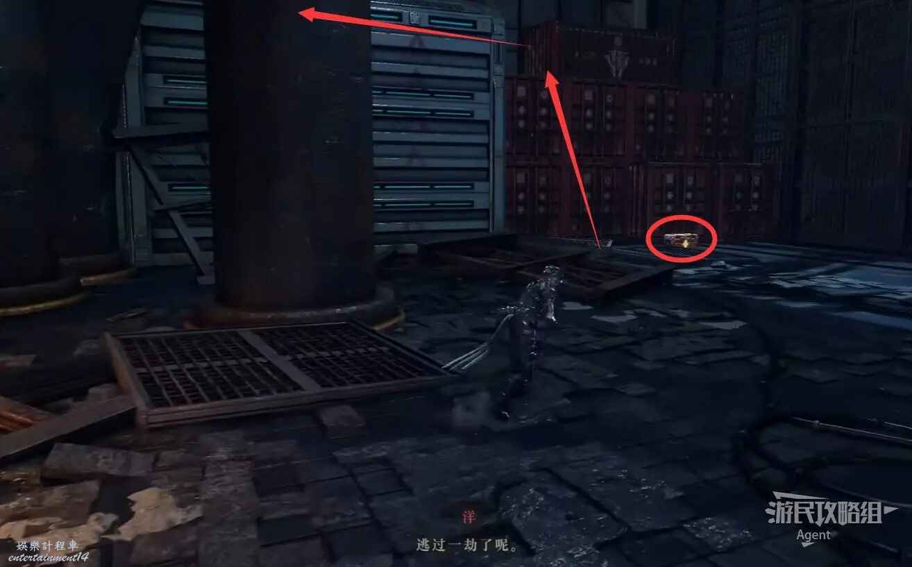 注意搜刮兩側,太蘭旁有兩個寶箱,另一邊藍色集裝箱上還有個寶箱。