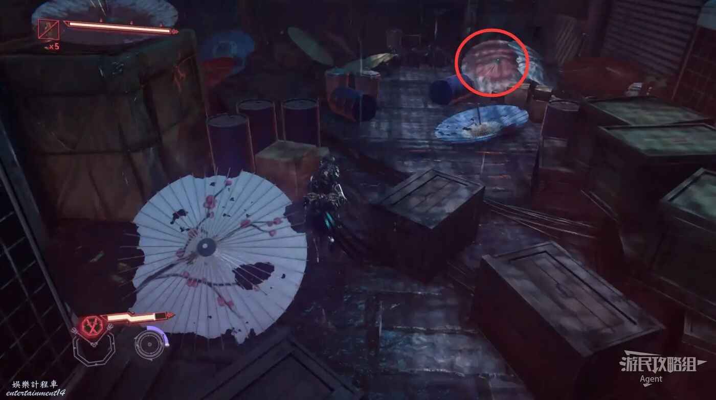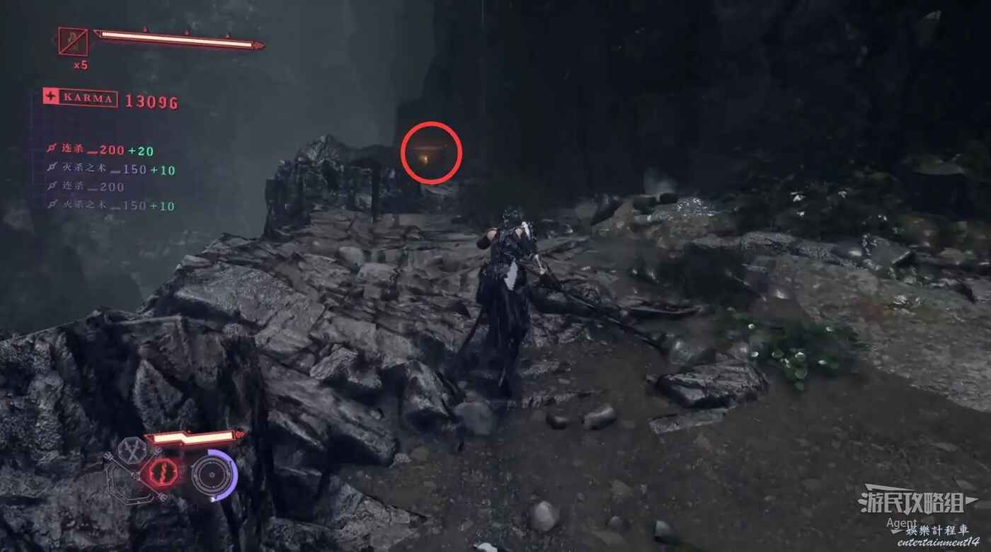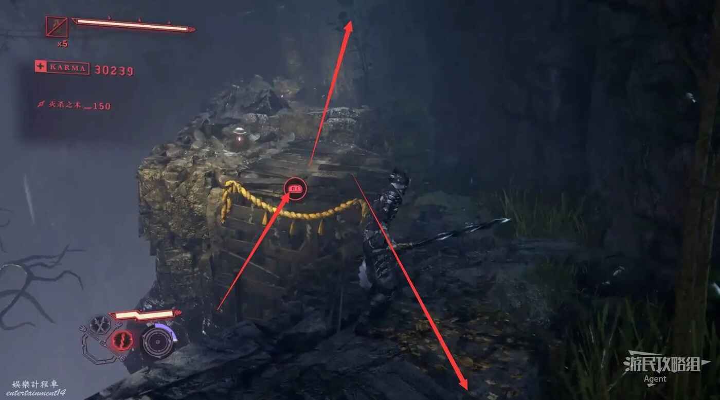 走上階梯看到根繩子,反覆攻擊繩子會出現幾波敵人,消滅敵人後拿到兩個寶箱,其中一個裡有【飾品】赤玉往生煙管。
