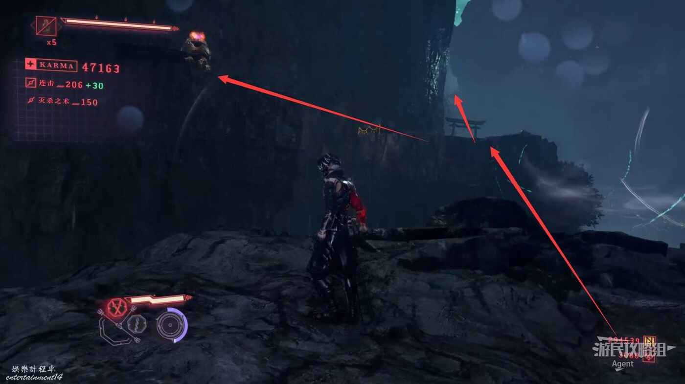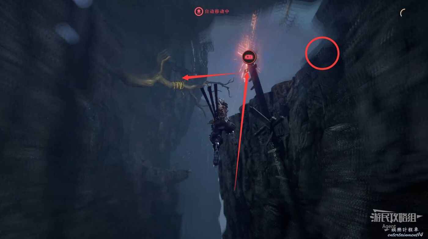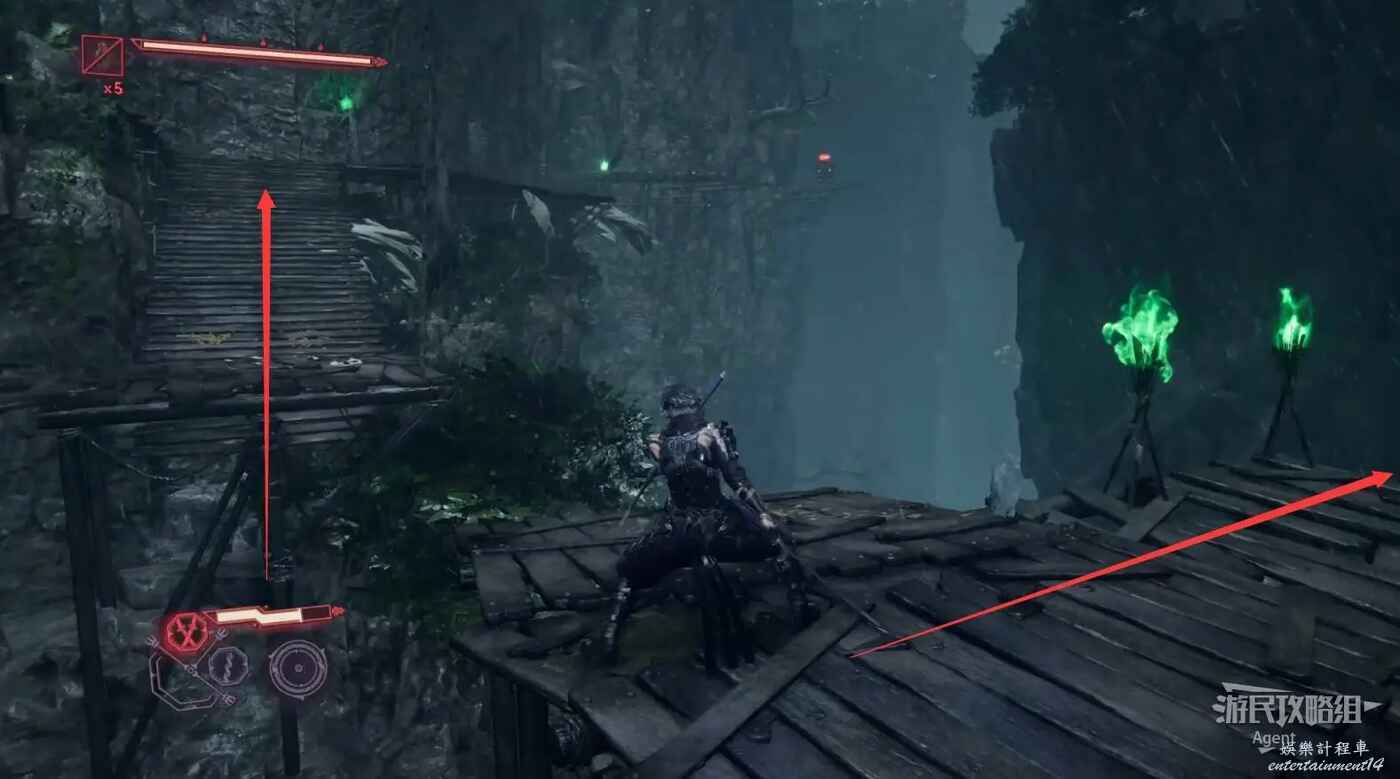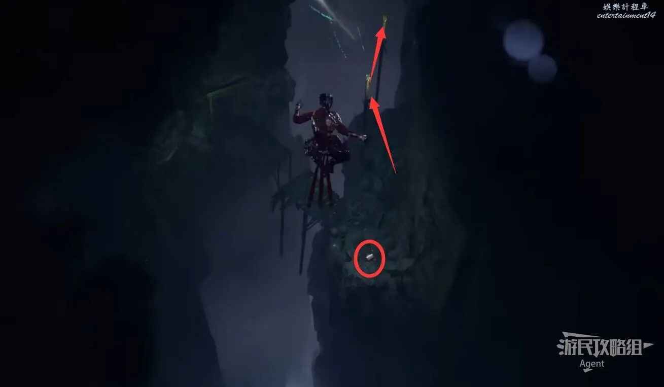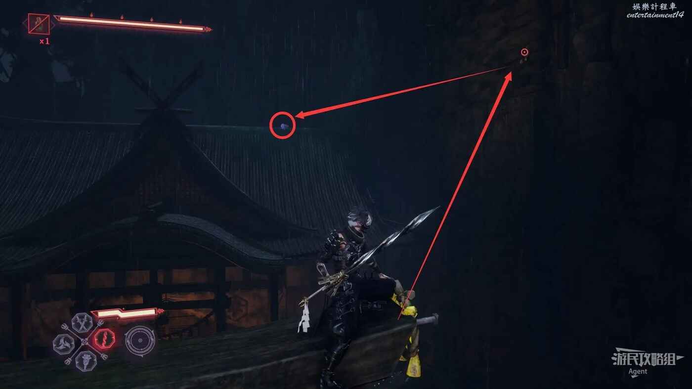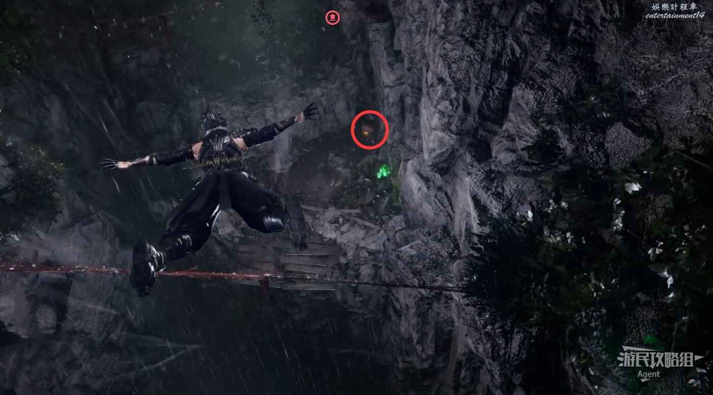 用抓鉤跑酷跳過懸崖拿到個寶箱,然後先別往上跳,注意左邊懸崖有個隱藏的跳躍岔路有個寶箱。