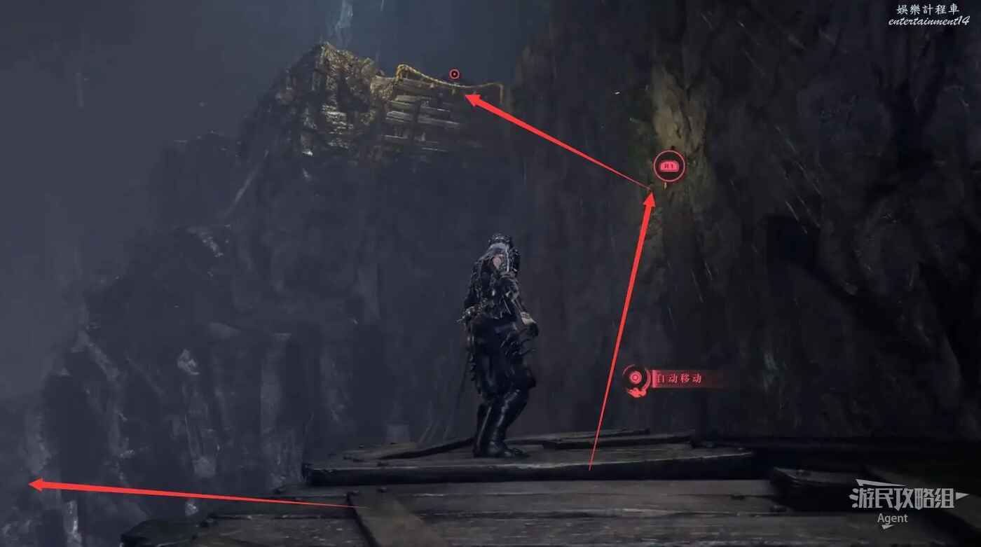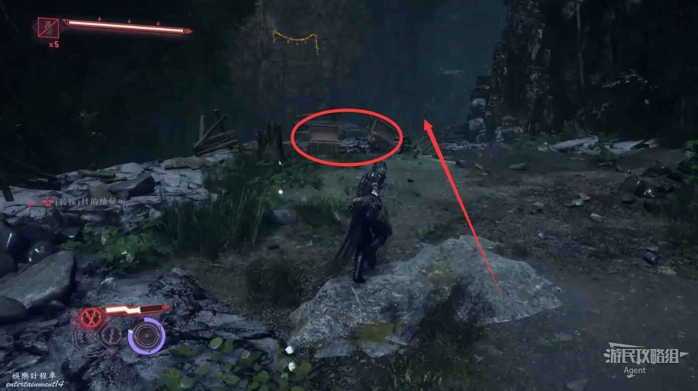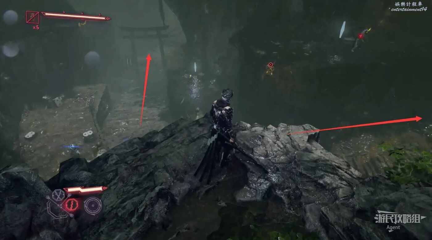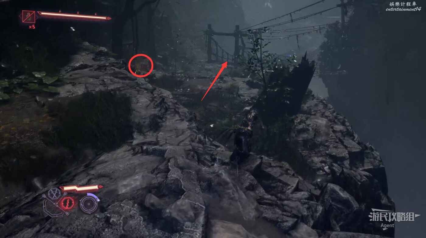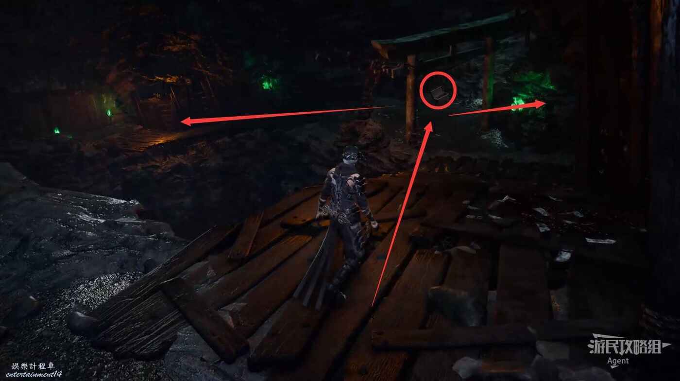 用抓鉤跑酷跳過懸崖拿到個寶箱,然後先別往上跳,注意左邊懸崖有個隱藏的跳躍岔路有個寶箱。