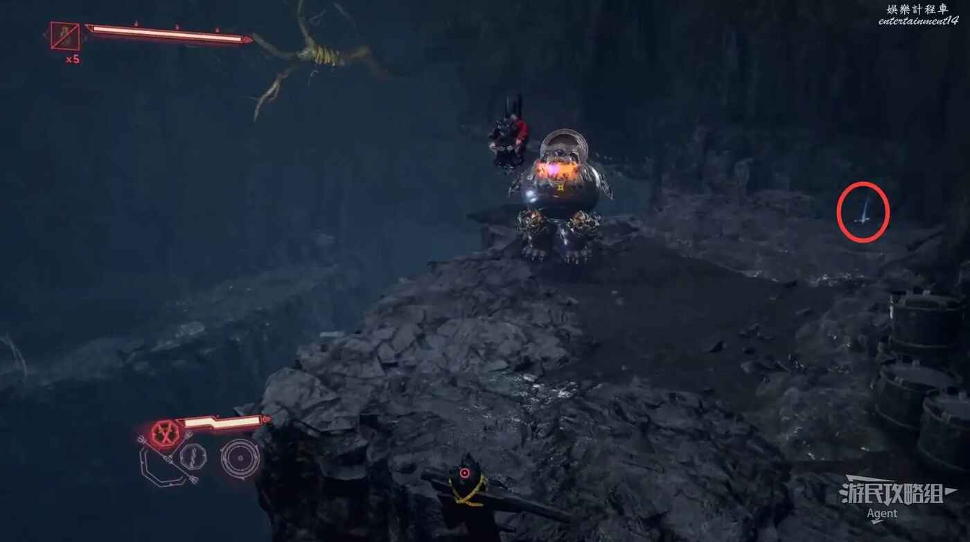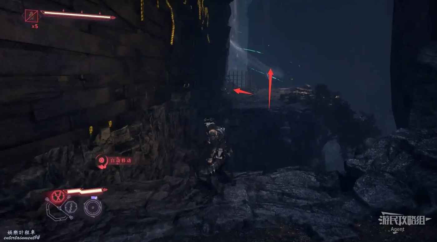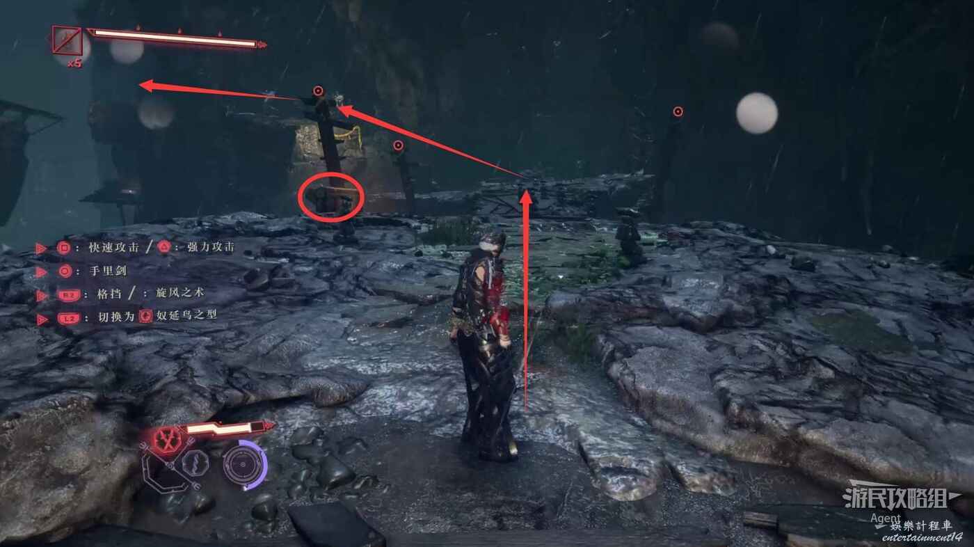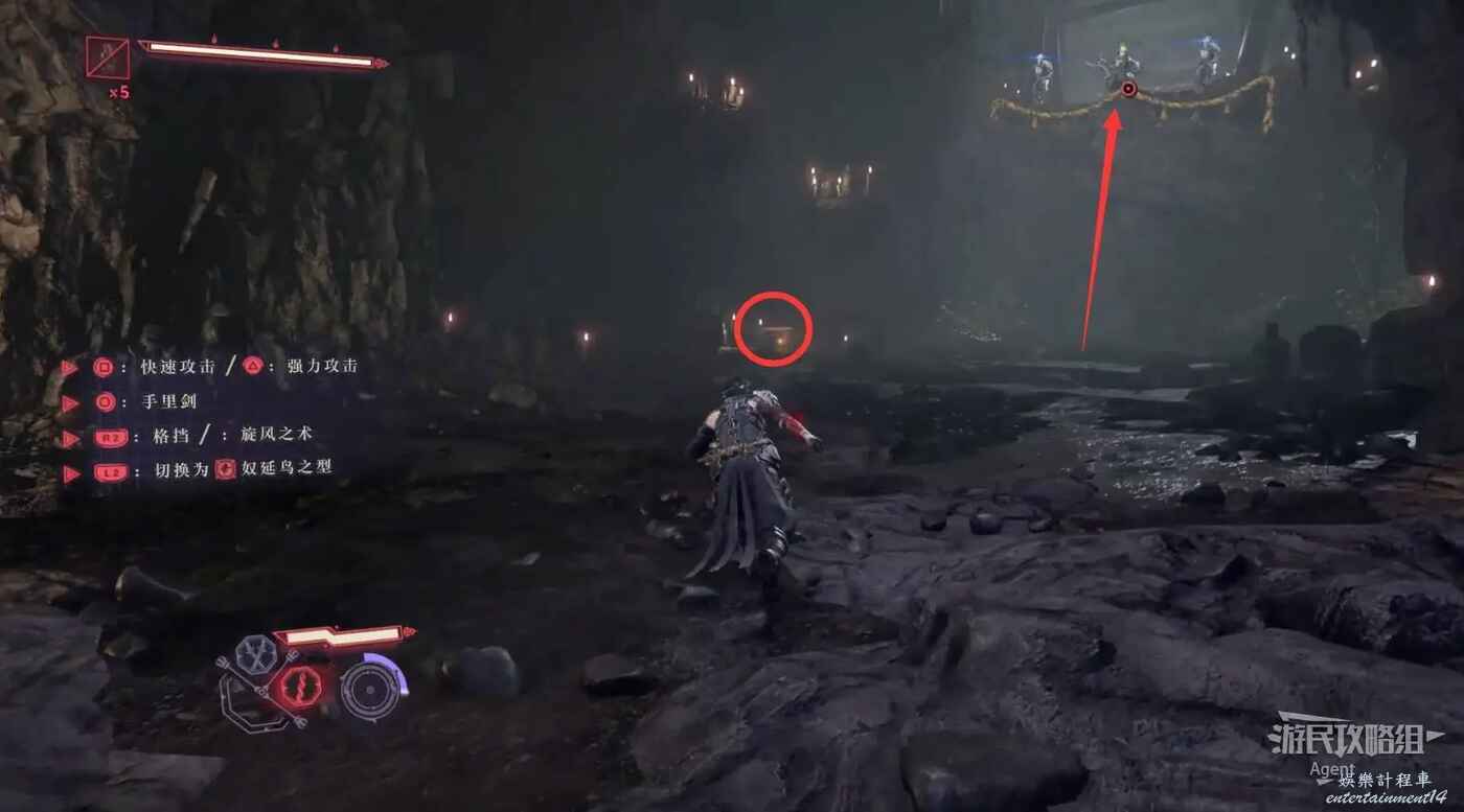 用抓鉤跳過山崖,往前走到頭有個寶箱,然後回來去左邊往上跳。