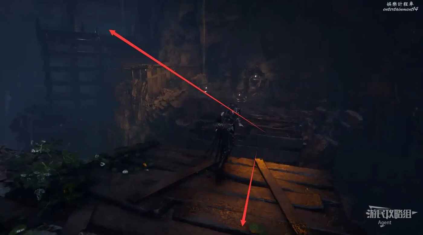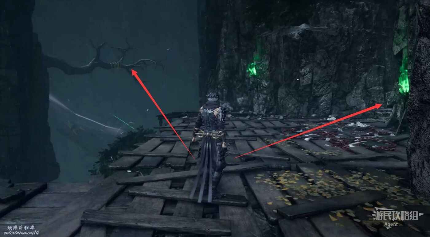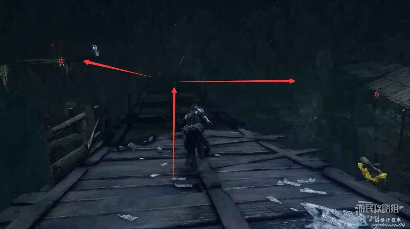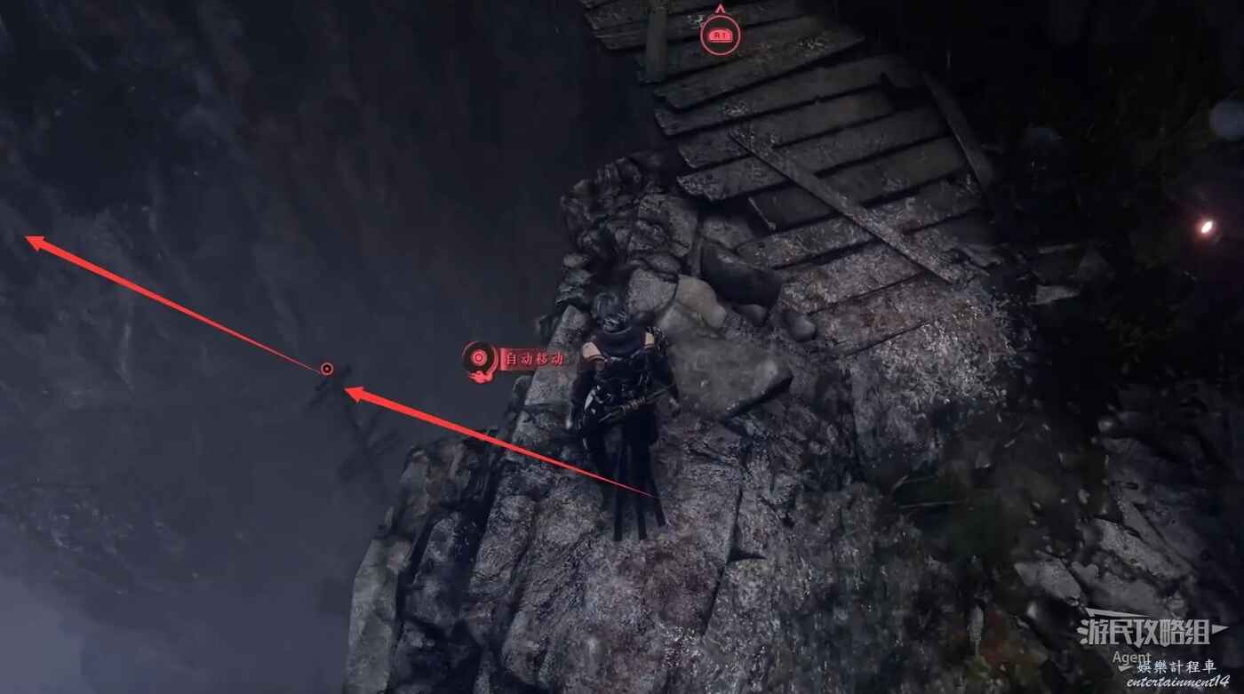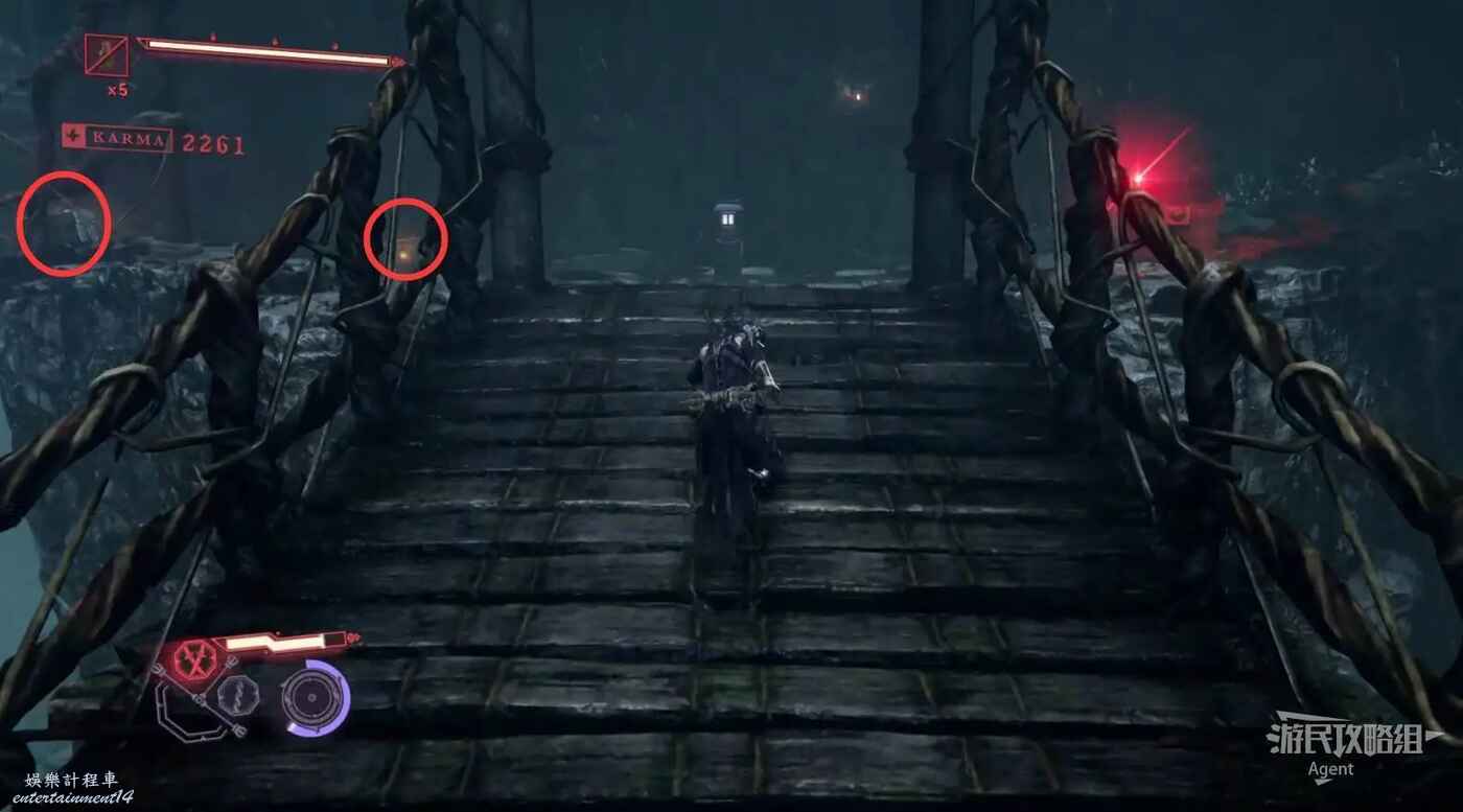 走下長階梯,消滅敵人後到高處蹬牆跑。經過小門後有個寶箱,擋路的木板直接砍碎來到懸崖邊。