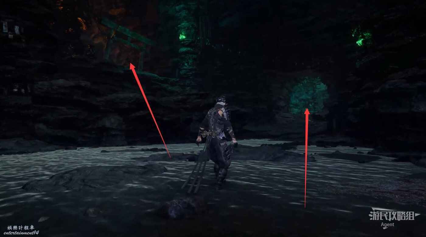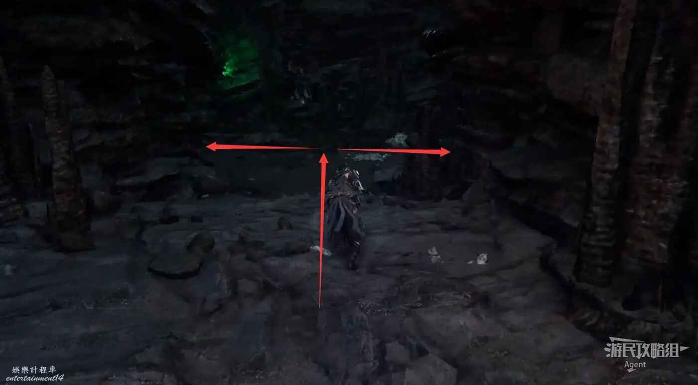 跑酷跳過懸崖,走上階梯看到綠色火光,右邊有個寶箱,然後回來走左邊進入山洞。
