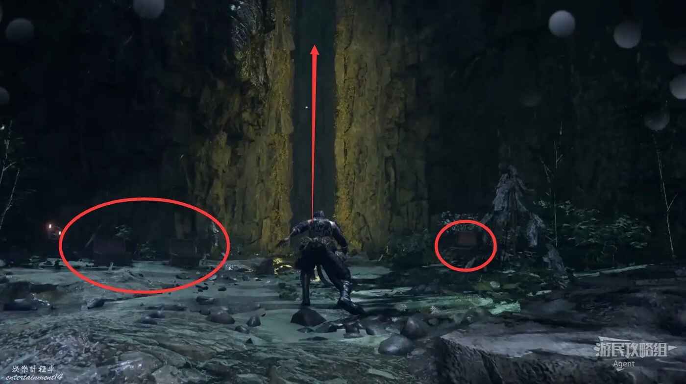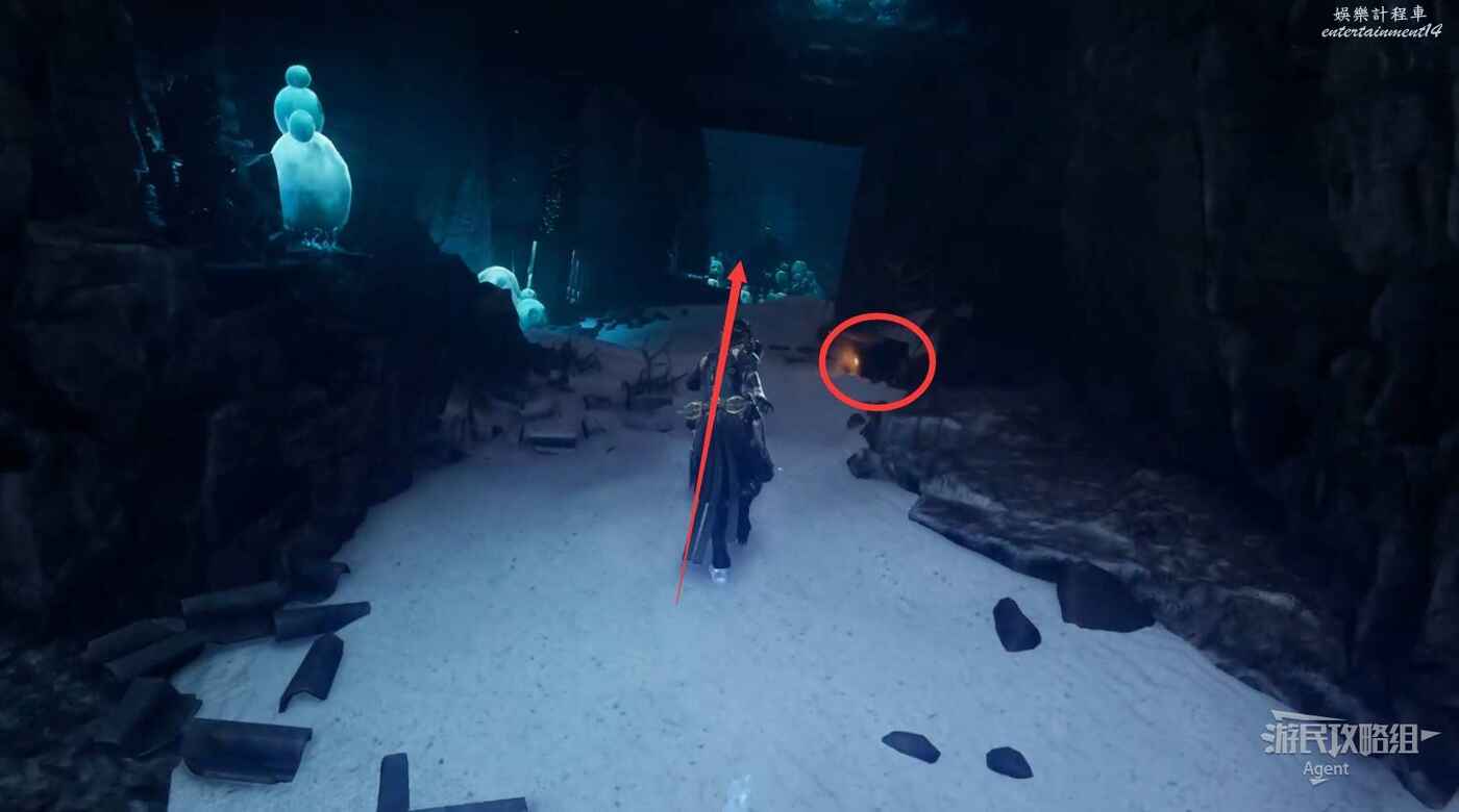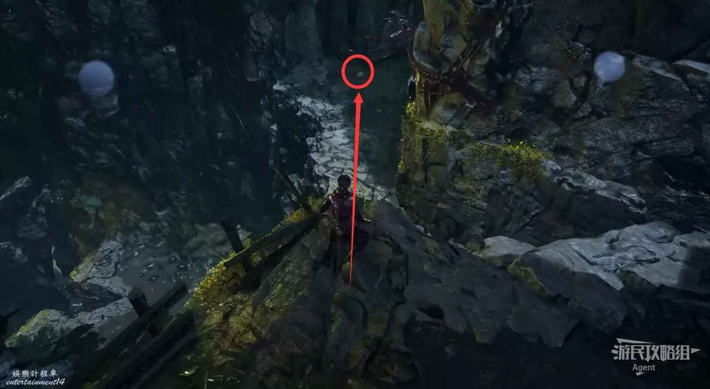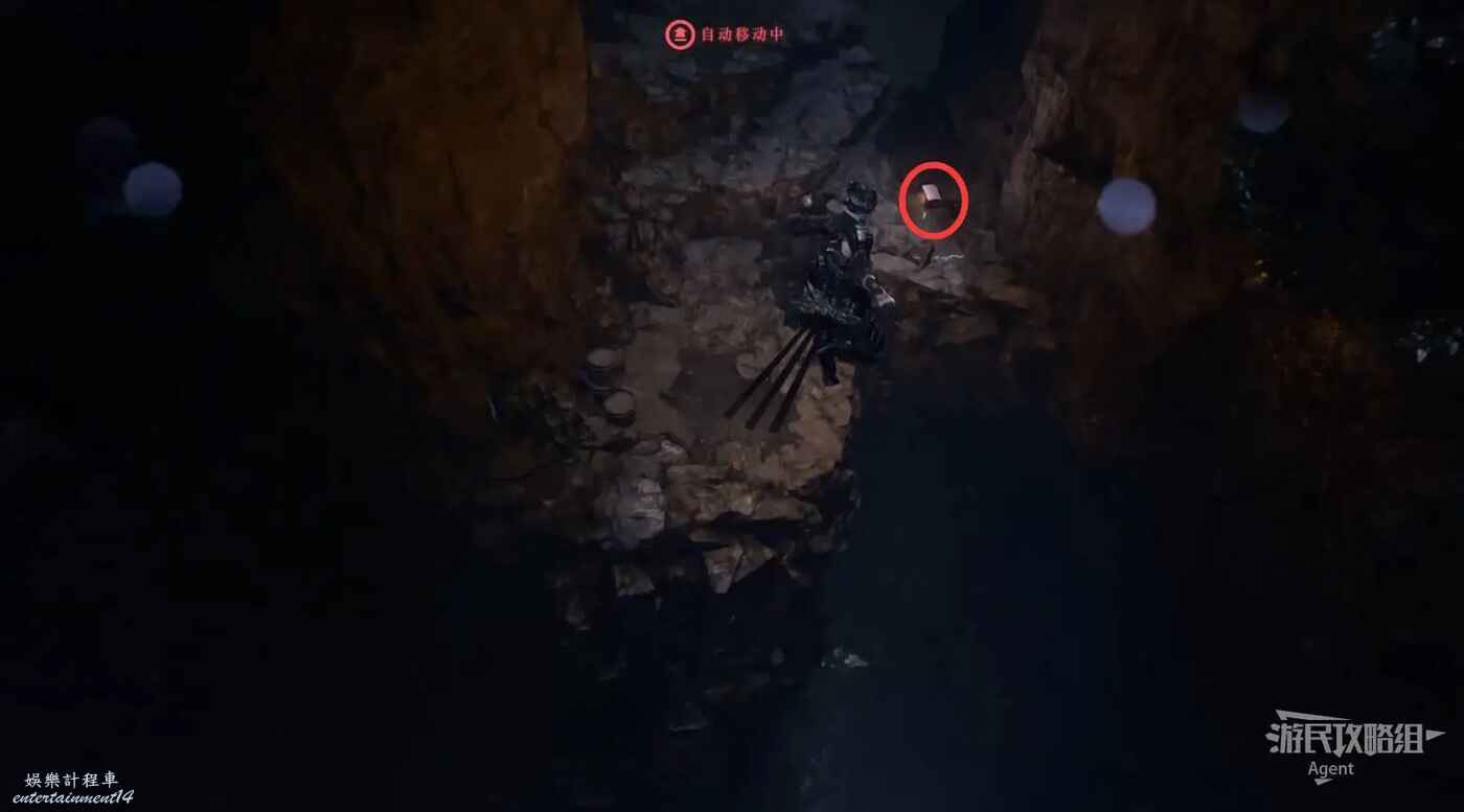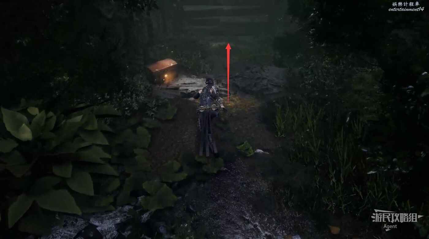 從豎井跳上來後,先左拐走背後的路拿個寶箱,然後回來往前走。