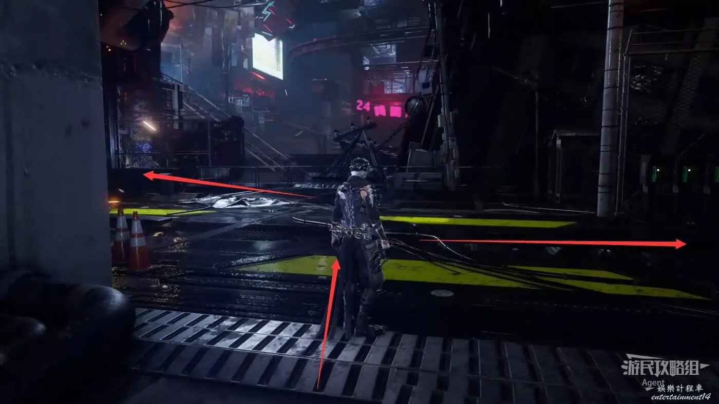衝刺滑鏟經過縫隙後,見到賽博朋克風的都市。