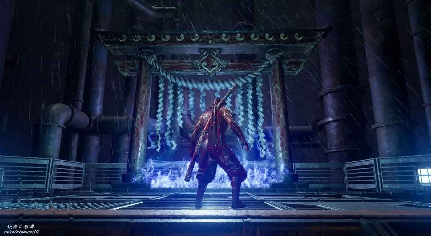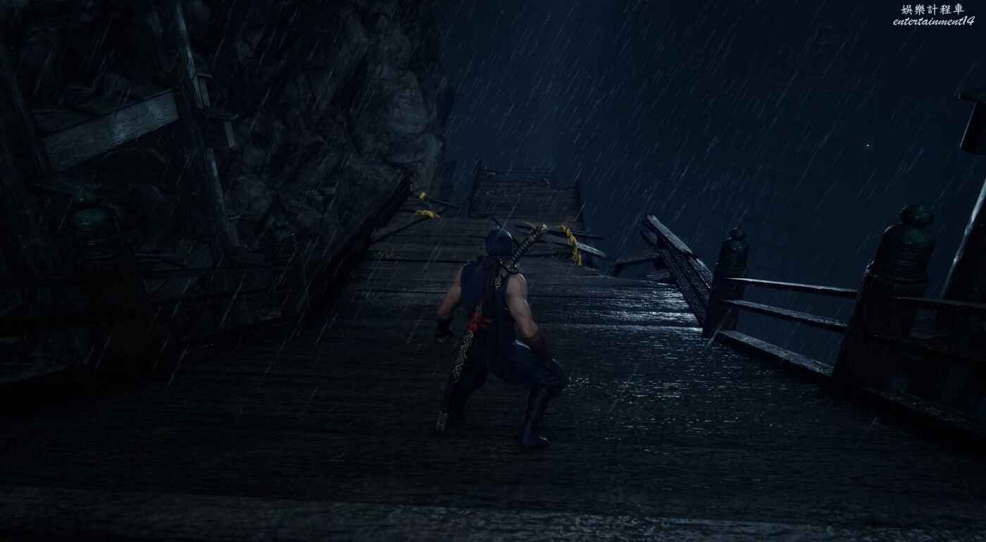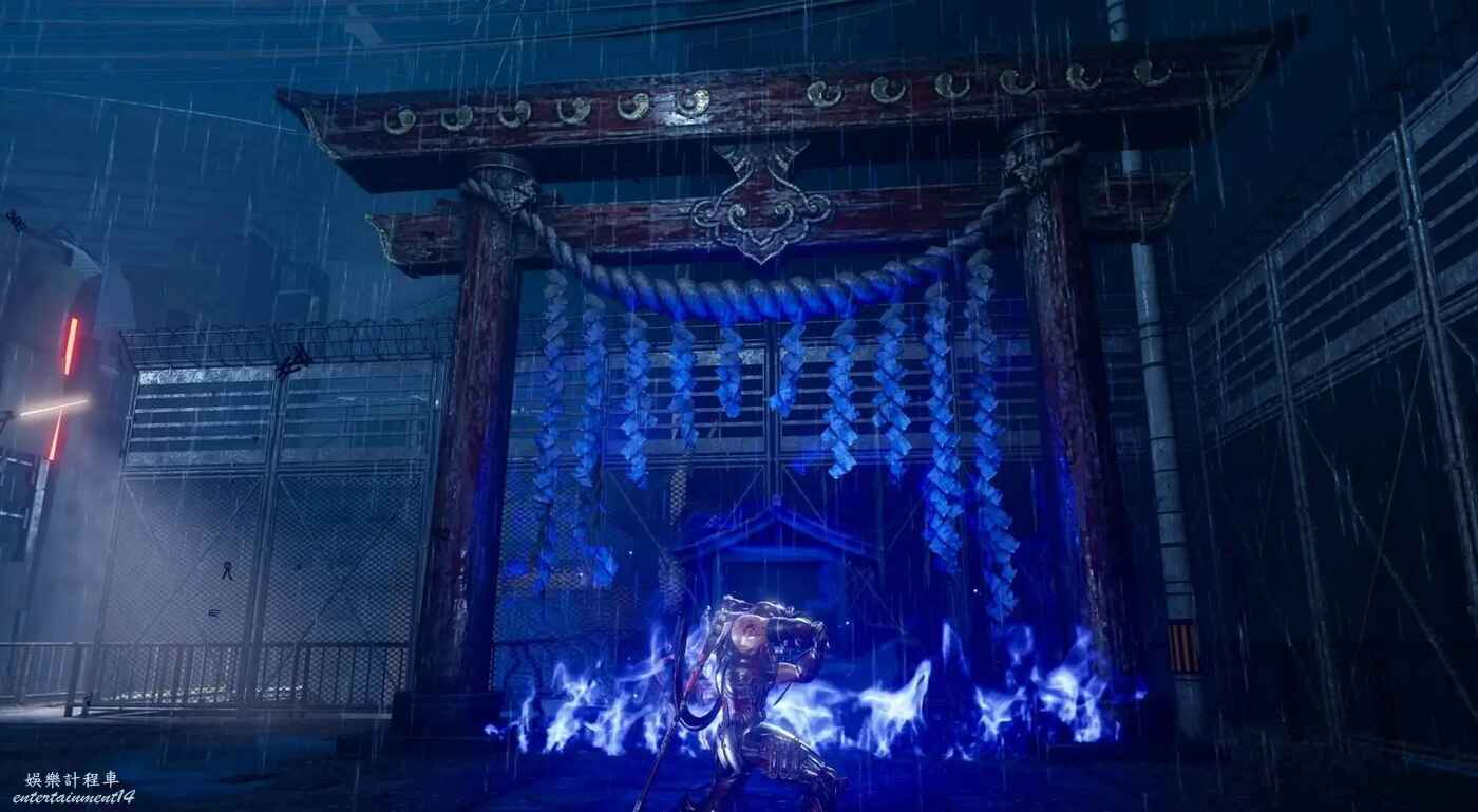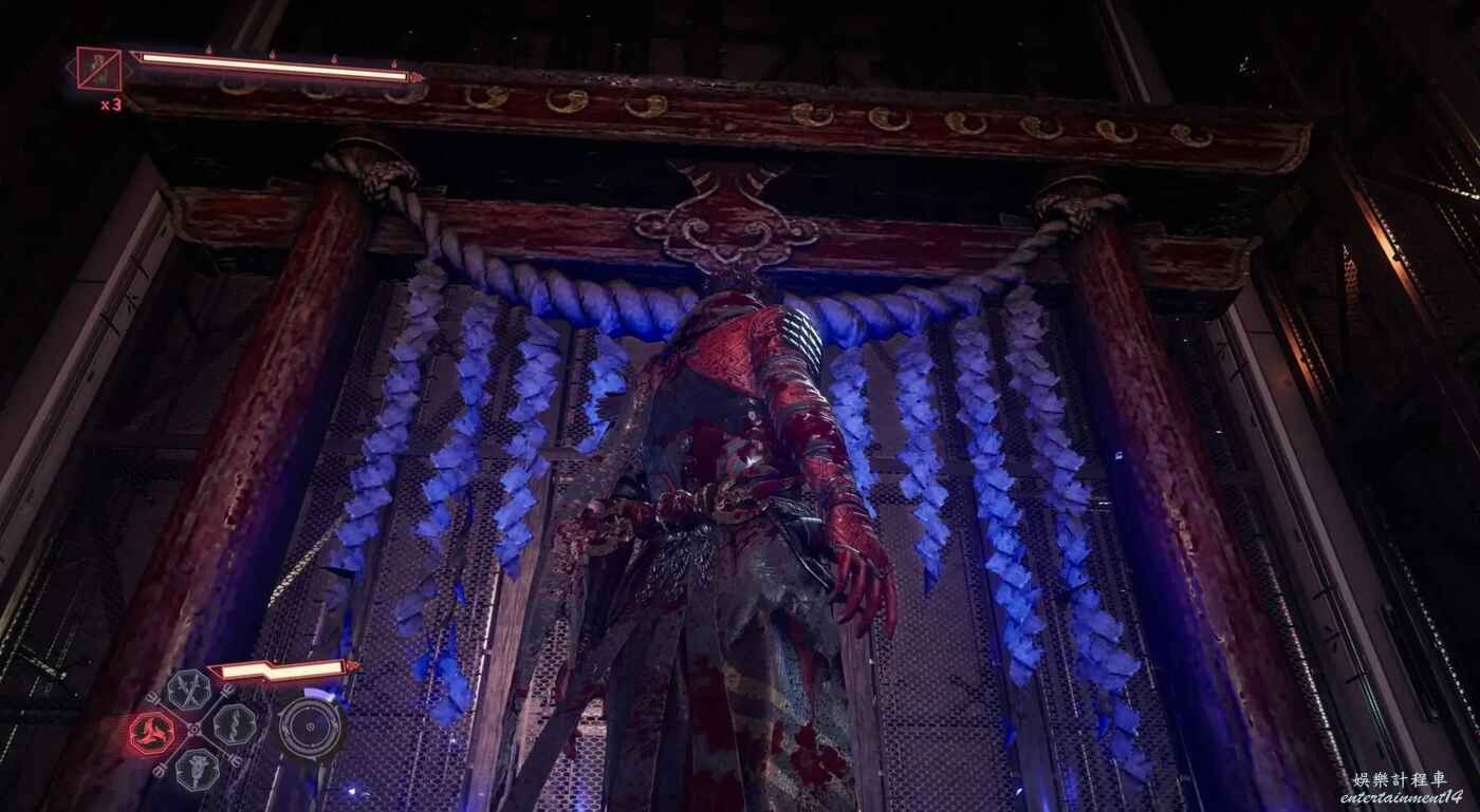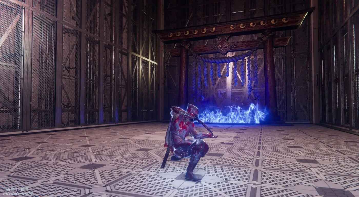 獲得鴉忍具【水馬】後來到迪斯可舞廳,清完敵人後走主通道右側大門,在兩個牆壁連續左右橫跳來到上層,駕駛水馬穿越水道即可到達此煉獄門位置。