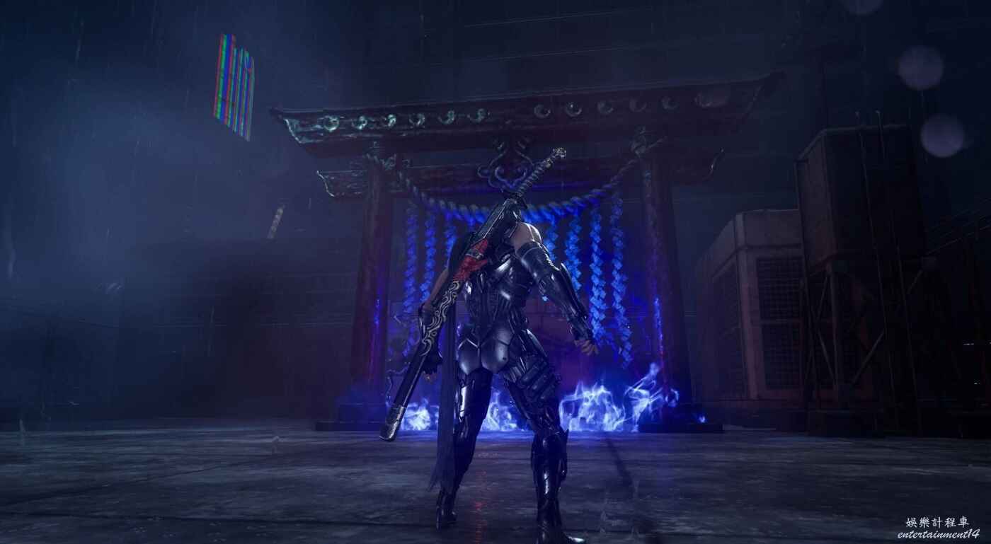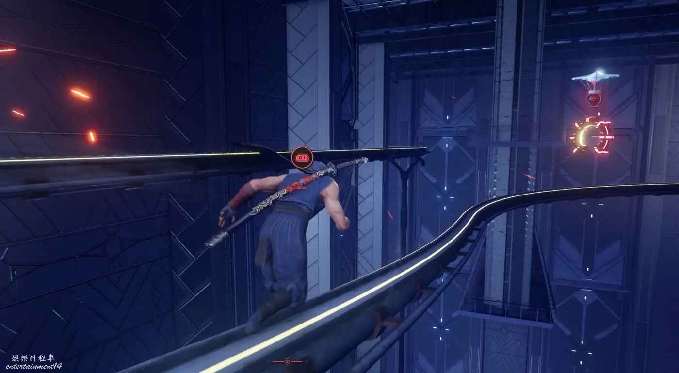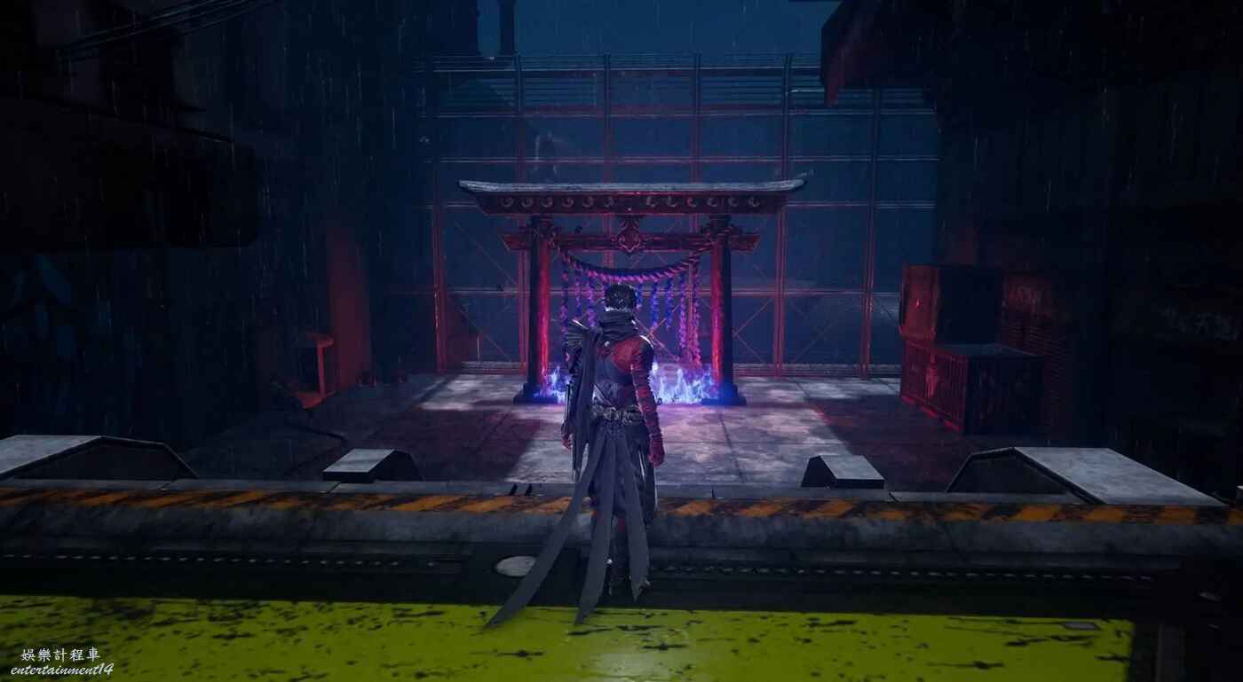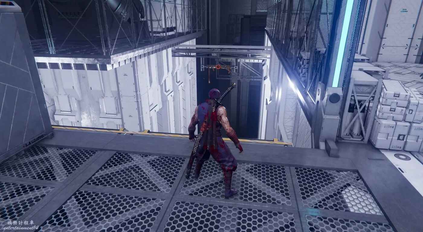 完成第一段滑軌場景後,利用抓鉤到達上層建築。擊碎下圖所示的藍色箱子,後方會出現新的滑軌通道,穿過這段滑軌上樓梯即可看到煉獄門。