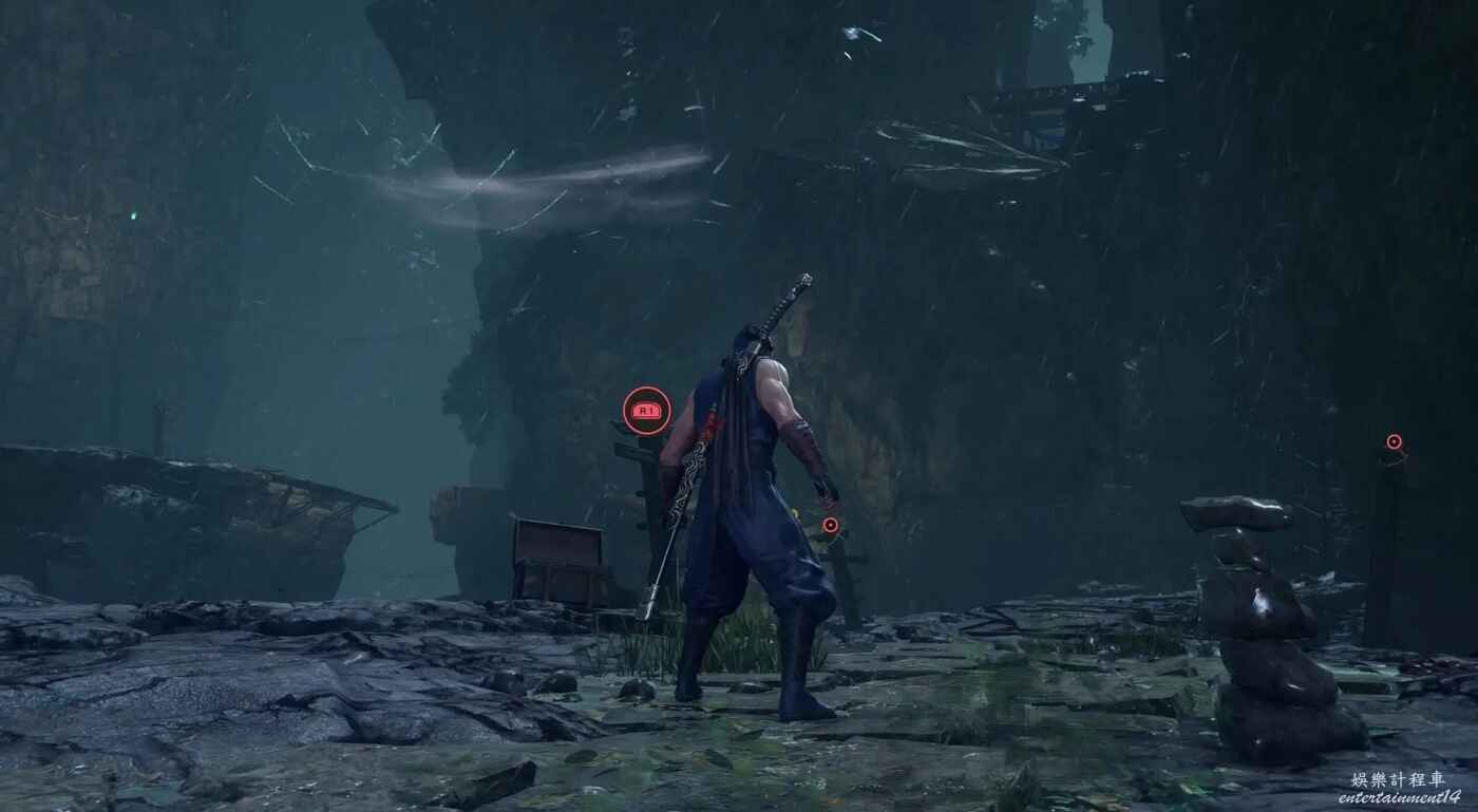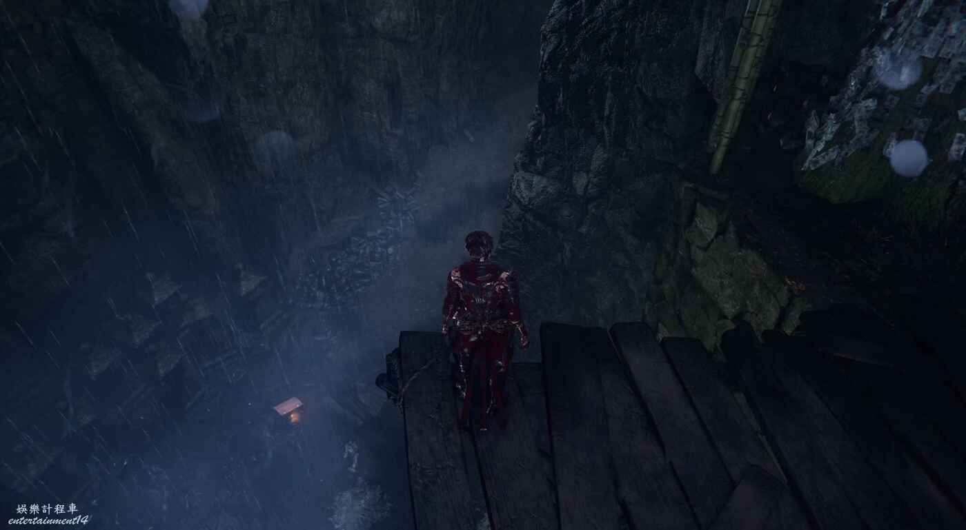途經洋的商店(綠色螢火蟲標記)後,從平台邊緣跳下峽谷繼續往前走,直到看見右側帶門的樓梯(當前位置無法開啟)。沿樓梯登上石橋再次跳下,在峽谷右側的道路盡頭可以找到。