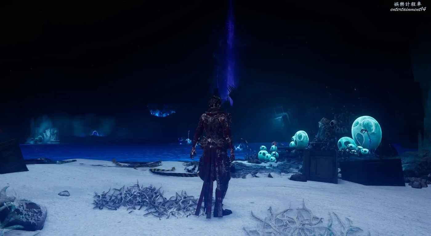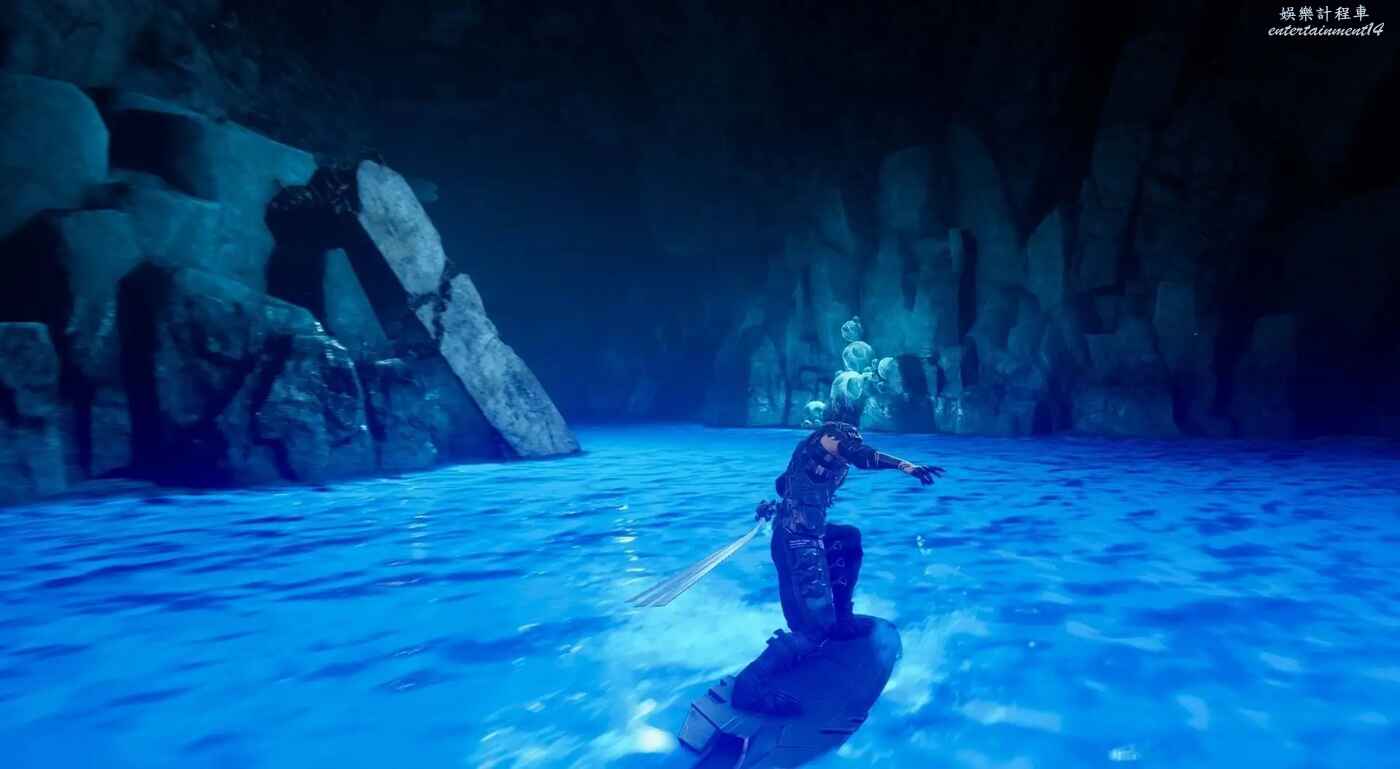到達第一個可使用衝浪板的大水池時,不要跟隨主線指引前進,左轉找到下圖所示的岩壁缺口,躍過後繼續沿路前進即可看到。