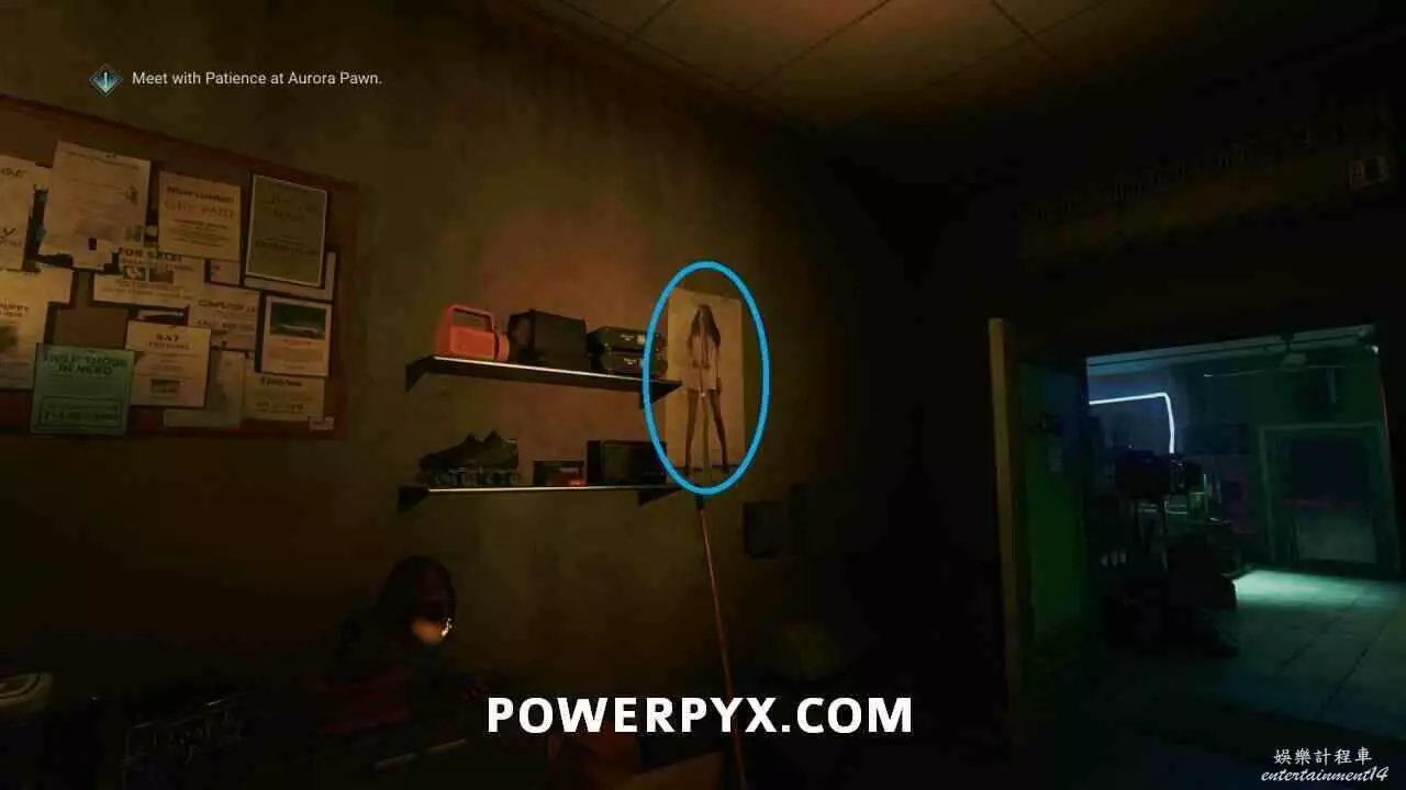 在奧羅拉典當行內尼科和佩璿斯所在位置之間的走廊中,釘在牆壁中央被撕成兩半的海報上。