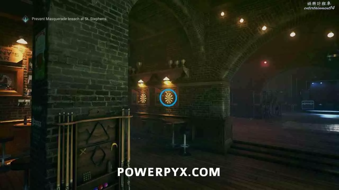 在牆洞酒吧內,後方區域的飛鏢靶上。