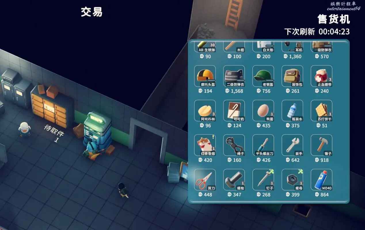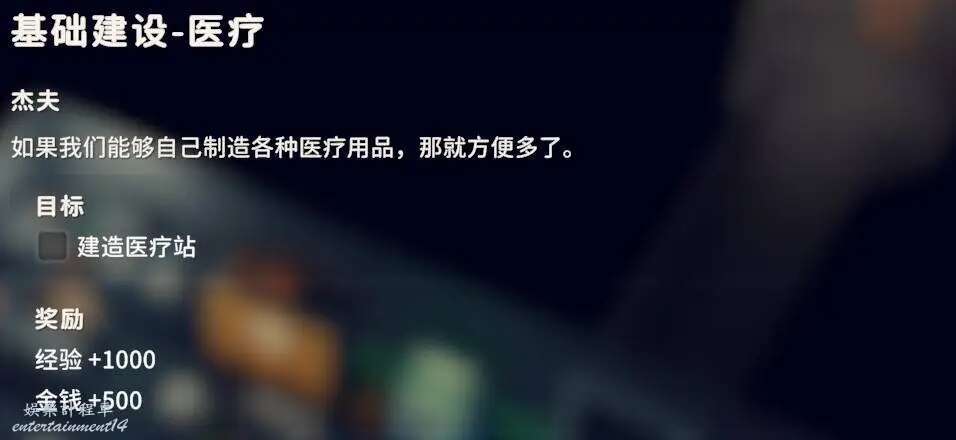 在地堡建造一個醫療站,建造醫療站需要一堆藥X2、注射器X1、輸液藥品X1、這三樣物品主要靠打開醫療箱子獲得,一堆藥獲取起來比較容易,輸液藥品可以在零號區的矮山商人那裡買到,注射器最難搞,所以遇到一定要帶回。