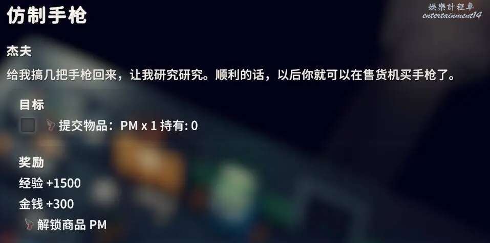 給傑夫一個PM手槍即可,對耐久度沒有任何要求,如果你沒有能夠找到,還可以通過工作台使用藍圖解鎖PM配方後製作再完成任務,之後就可以直接購買這把槍了。