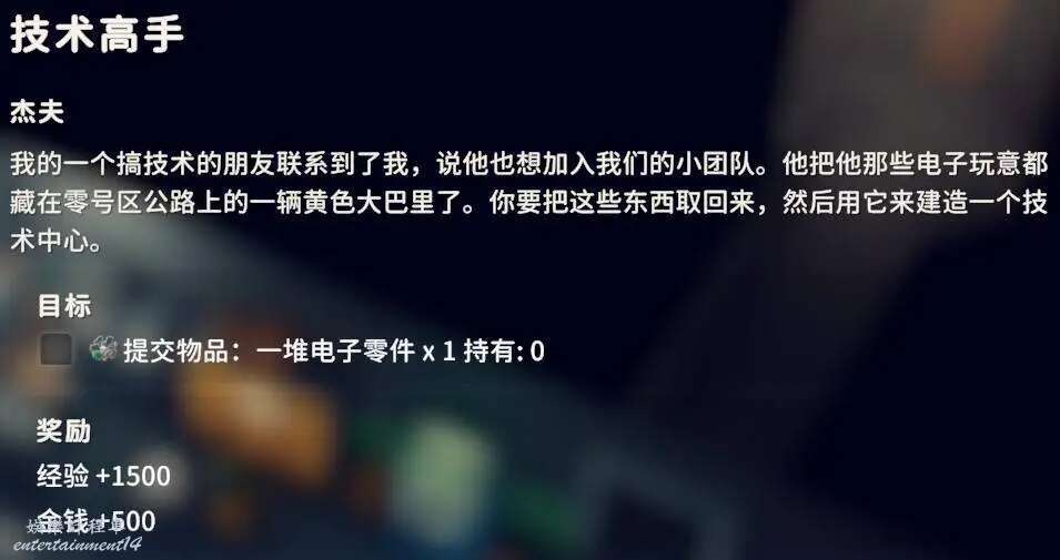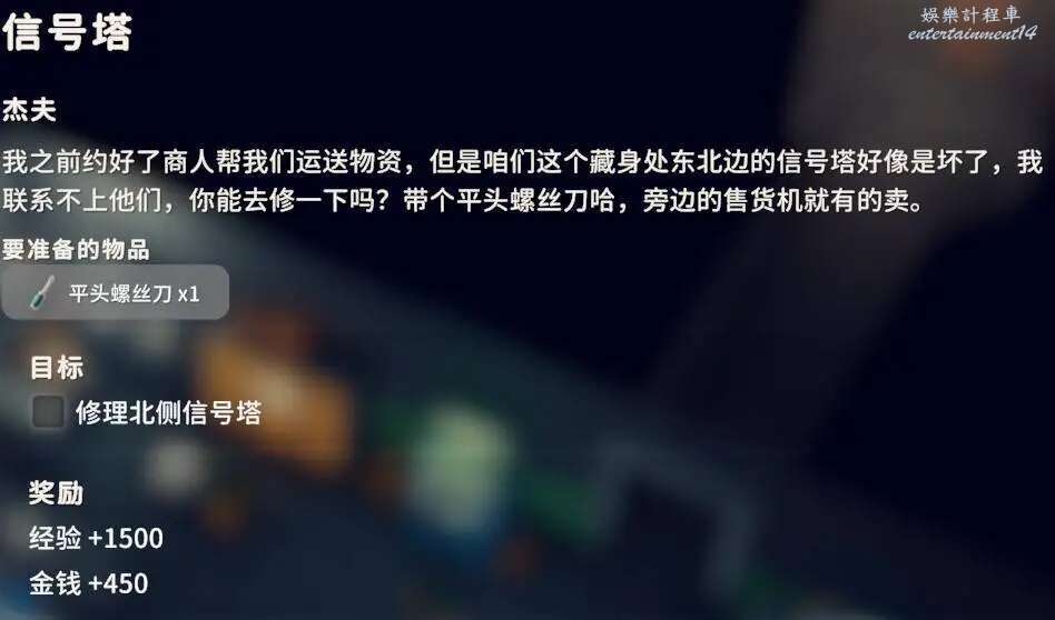 維修下圖角色所在位置的信號塔,記得帶上平頭螺絲刀,如果沒有搜刮到的話地堡的商店有賣。
