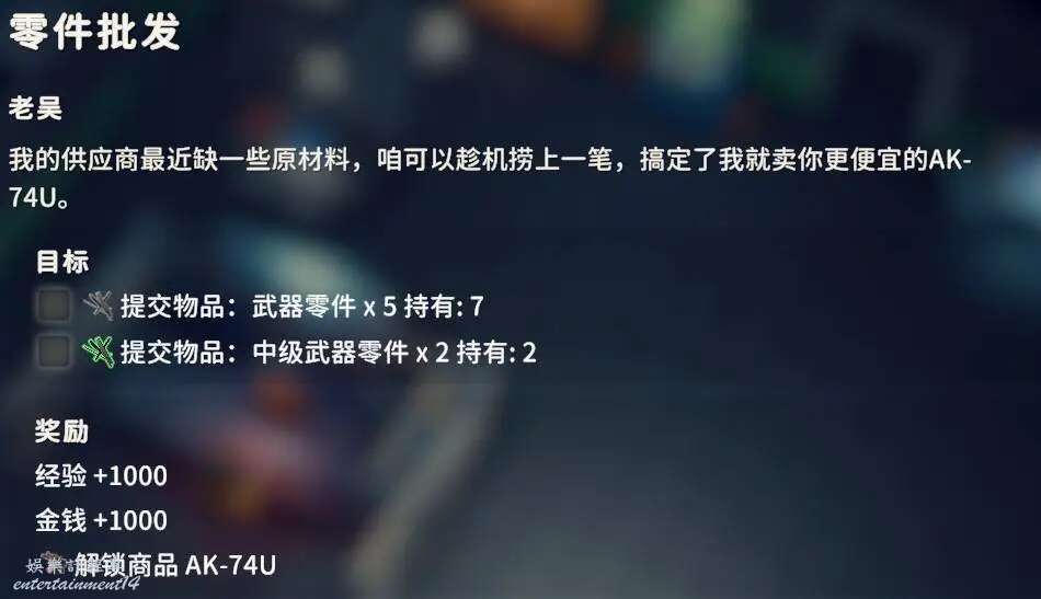 給傑夫交付一個格力克就可以,武器在零號區就有敵人會掉落,這個任務會在我們工作台升級之後才會接到,所以之前沒有存貨的話直接做一個就行,需要消耗5個武器零件。