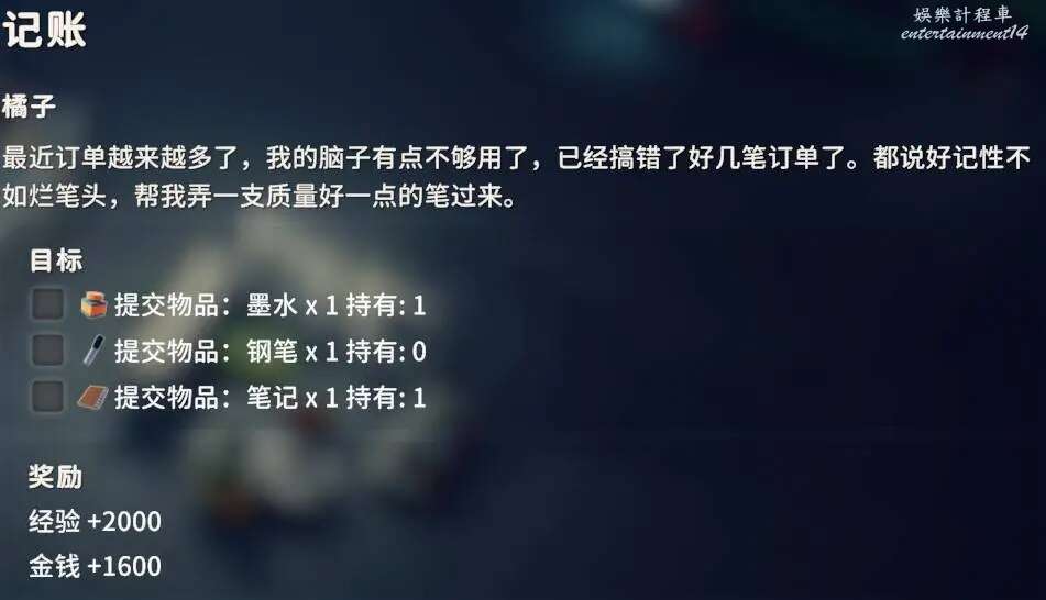 交付墨水X1、鋼筆X1、筆記X1,之前任務道具就給了我們一個墨水,筆記獲取難度不算高,到這個任務階段應該多少有一兩個,沒有的話可以在零號區矮山神秘商人那裡買,記得要帶現金,沒有就帶點之前的去賣換現金。