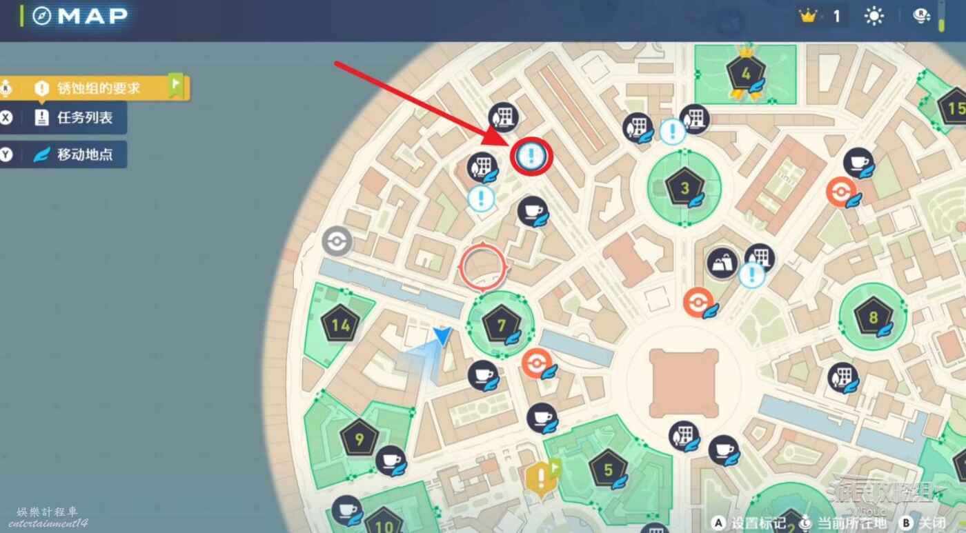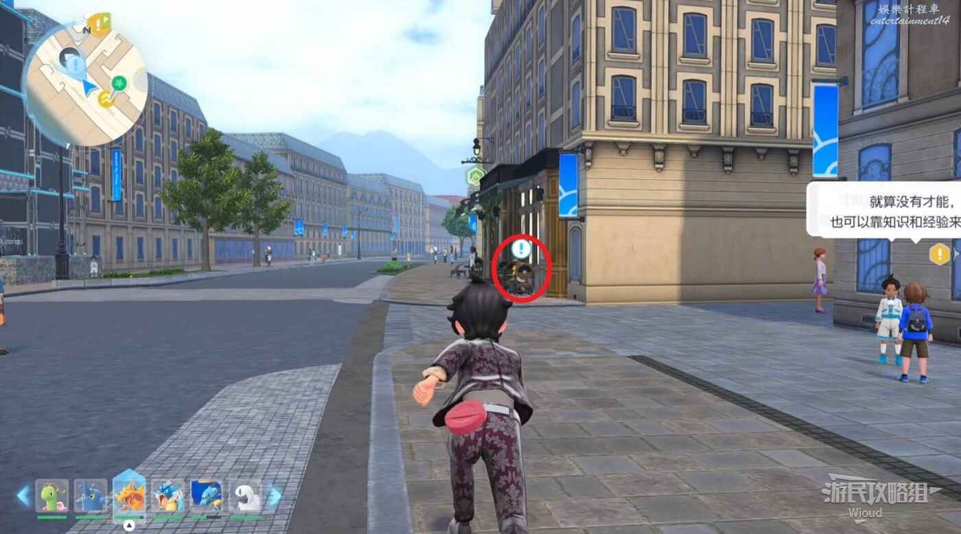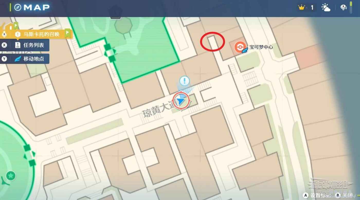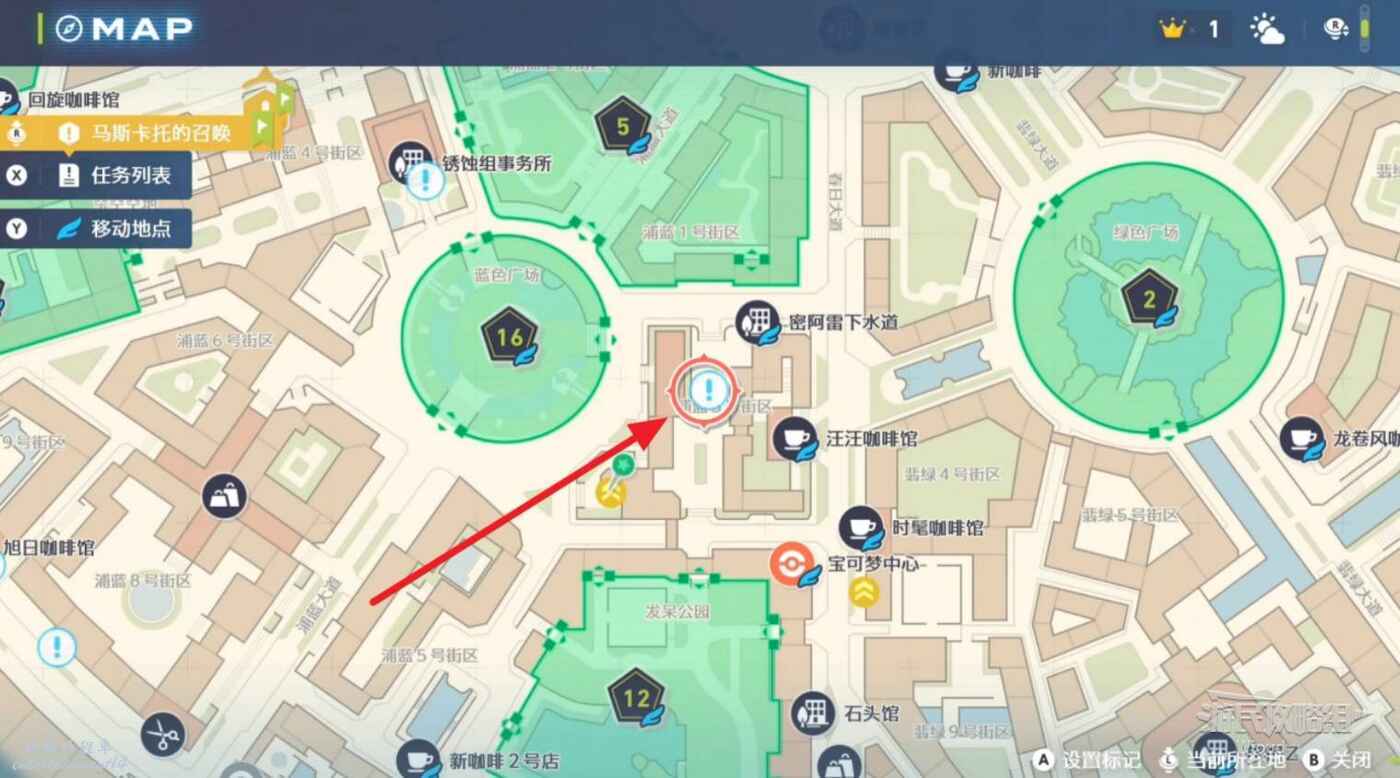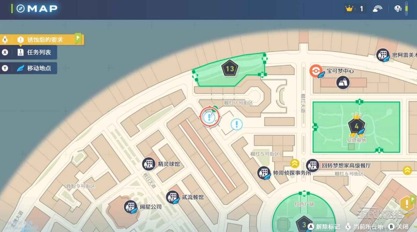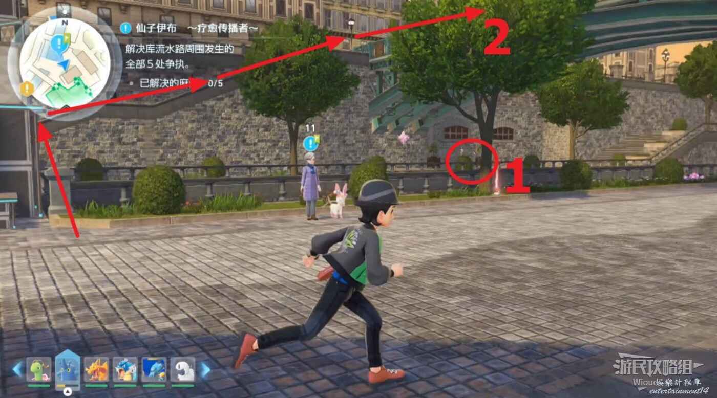任務接取位置如下圖所示,到街道旁和發佈人對話,得知需要用招式【污泥炸彈】擊打旁邊的物體。