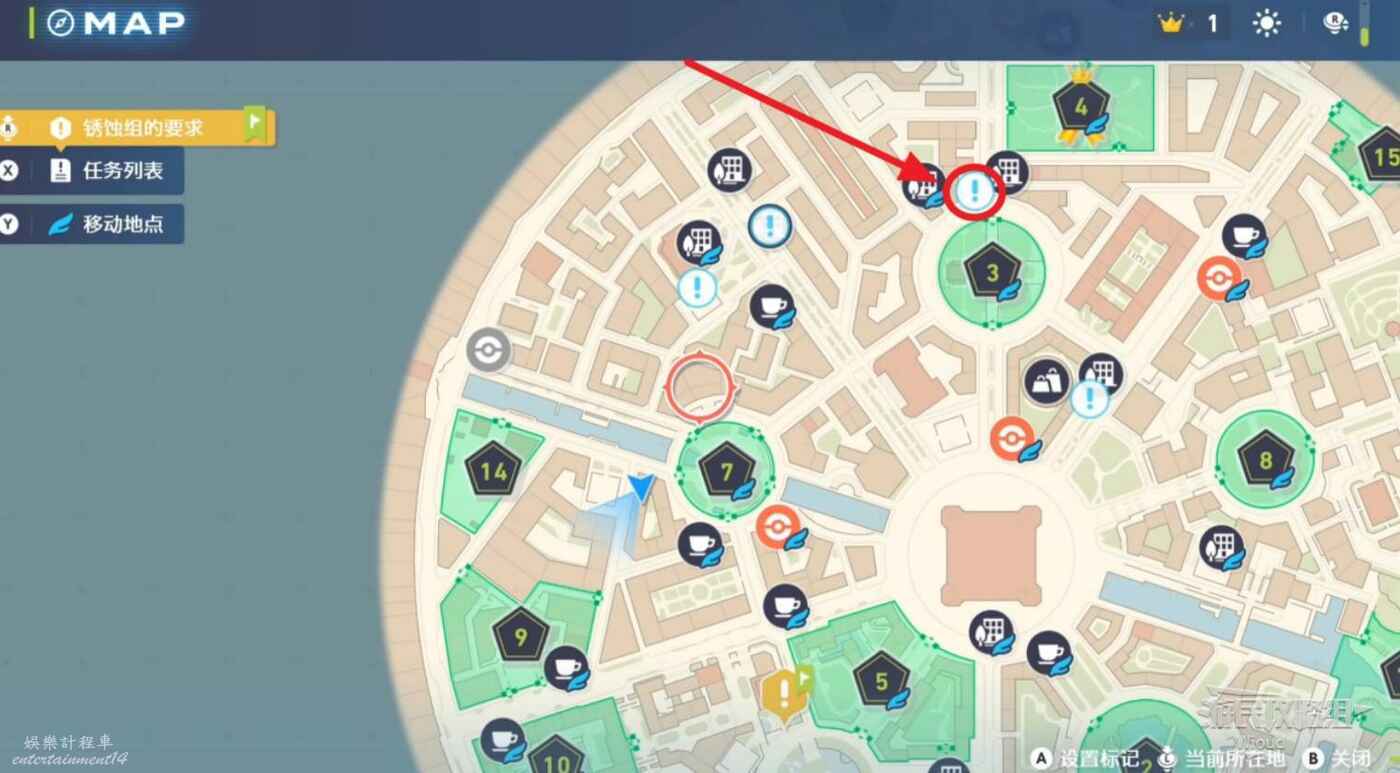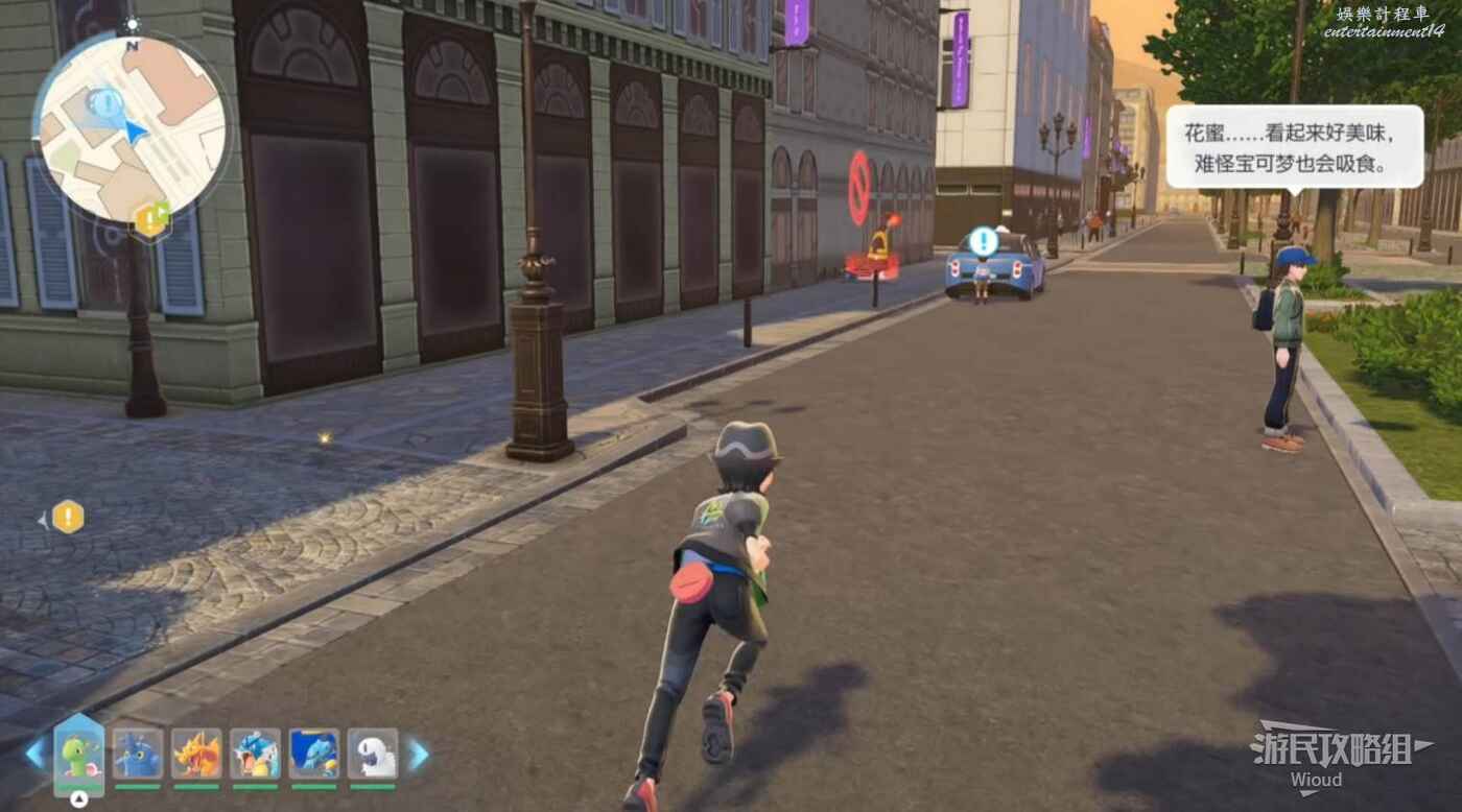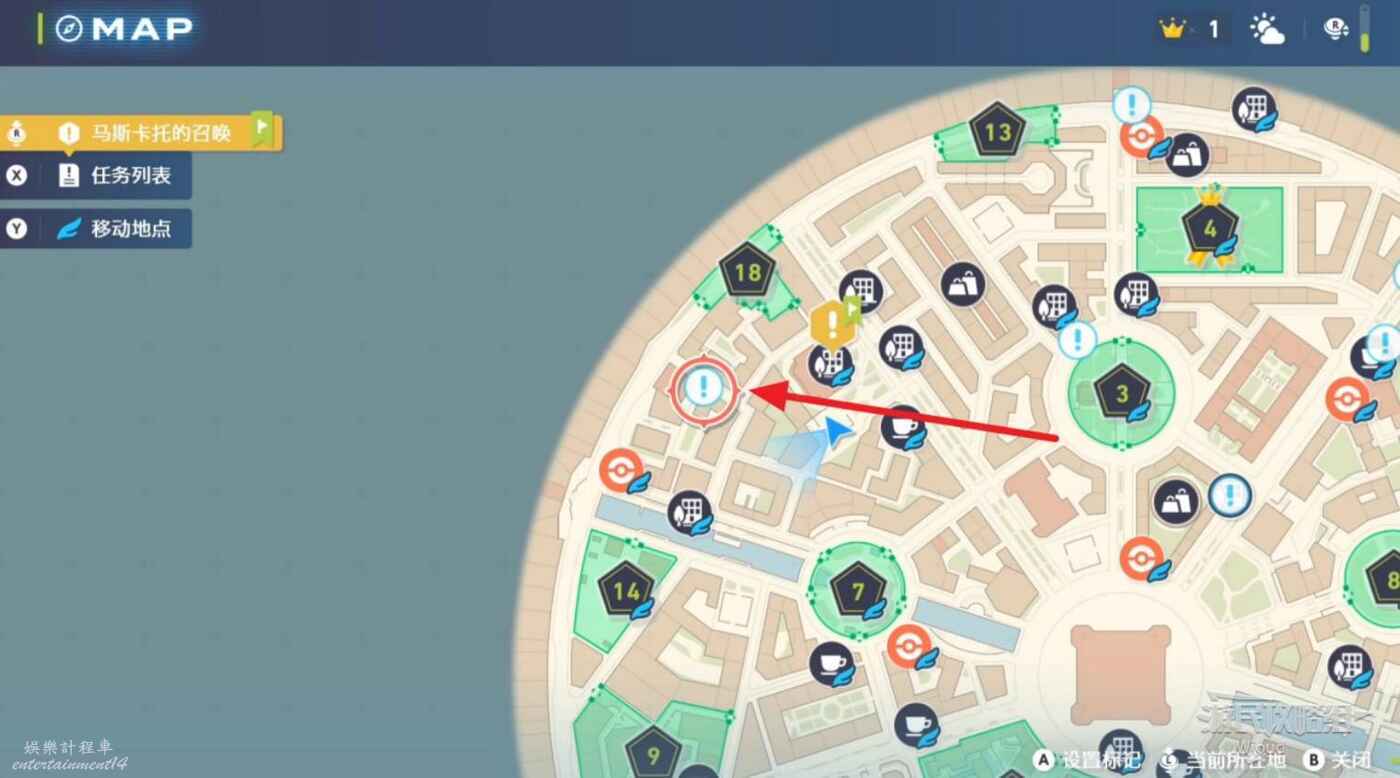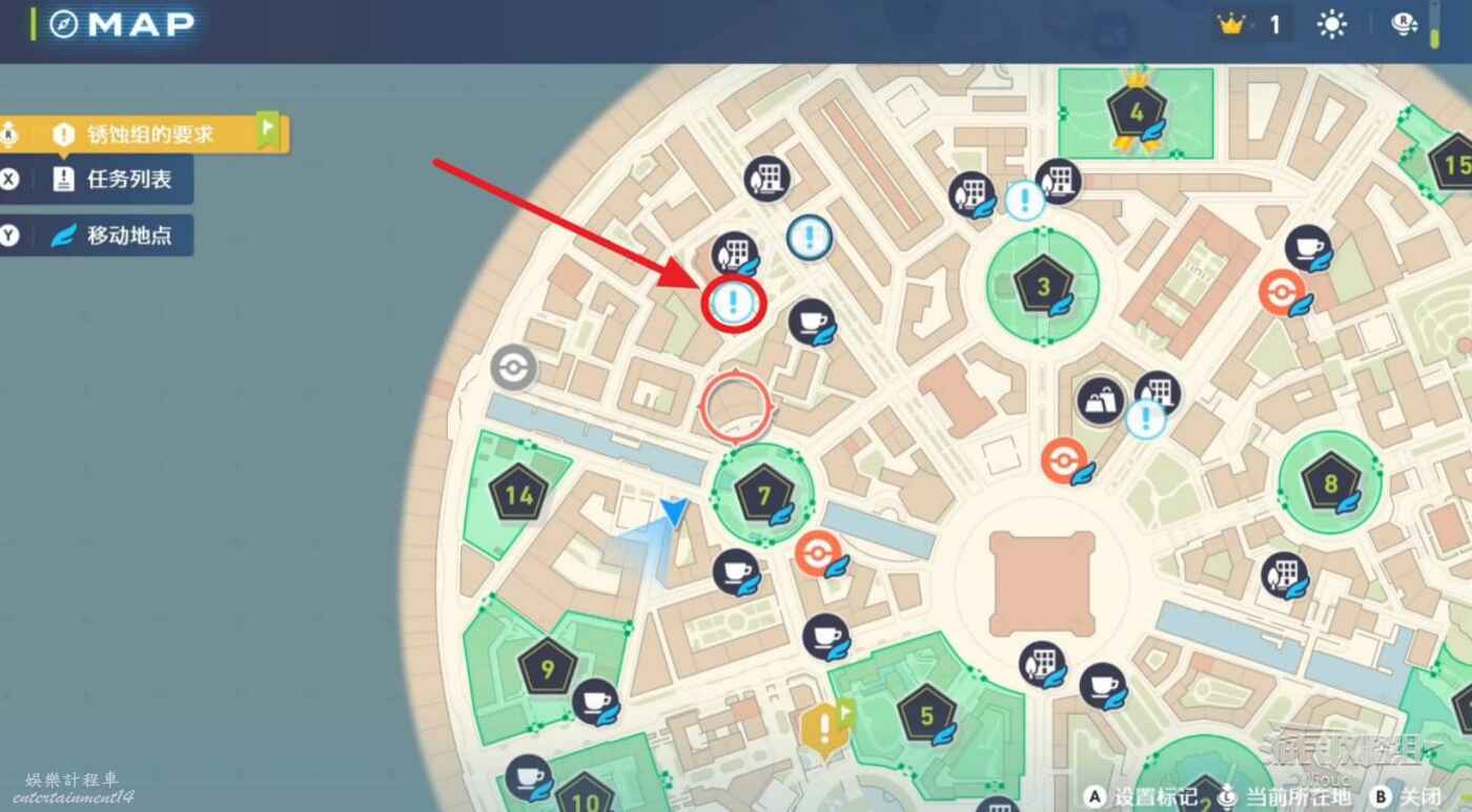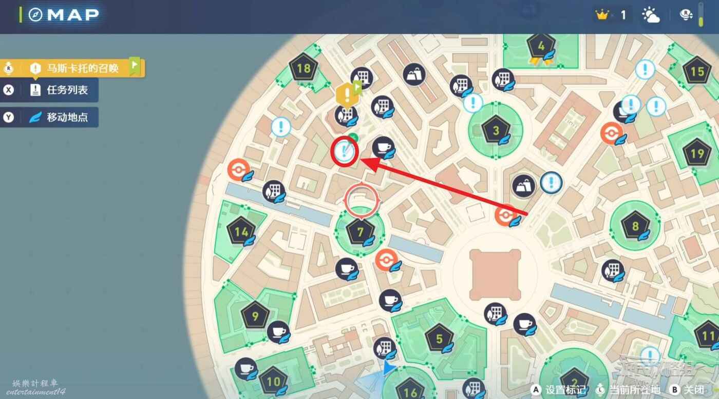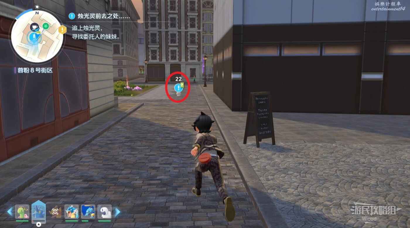 任務接取位置如下圖所示,到街道旁和發佈人對話,得知需要用招式【污泥炸彈】擊打旁邊的物體。