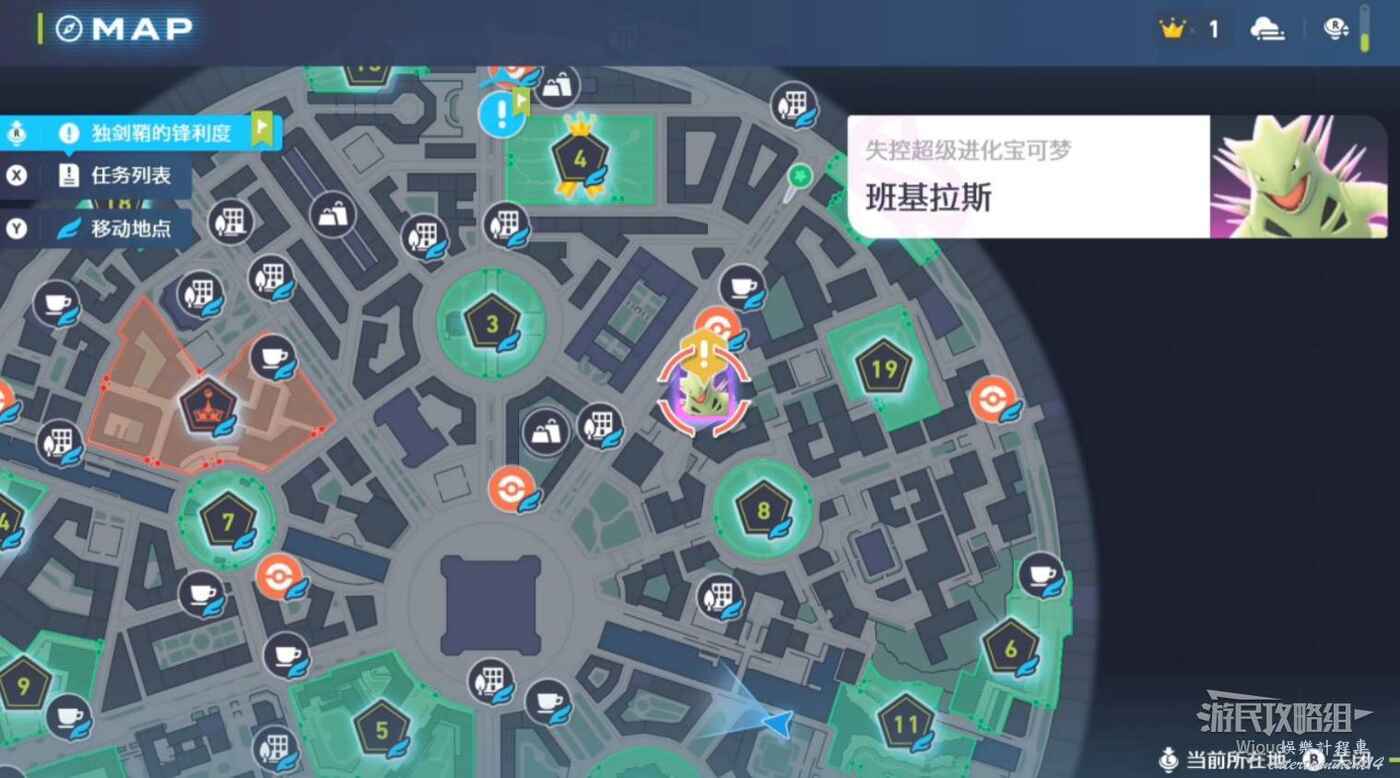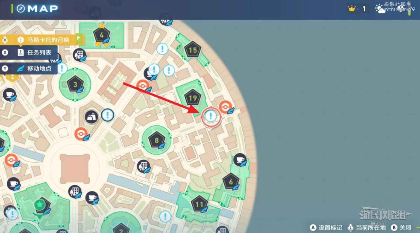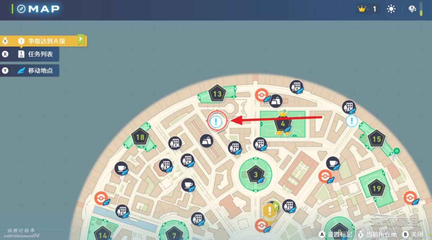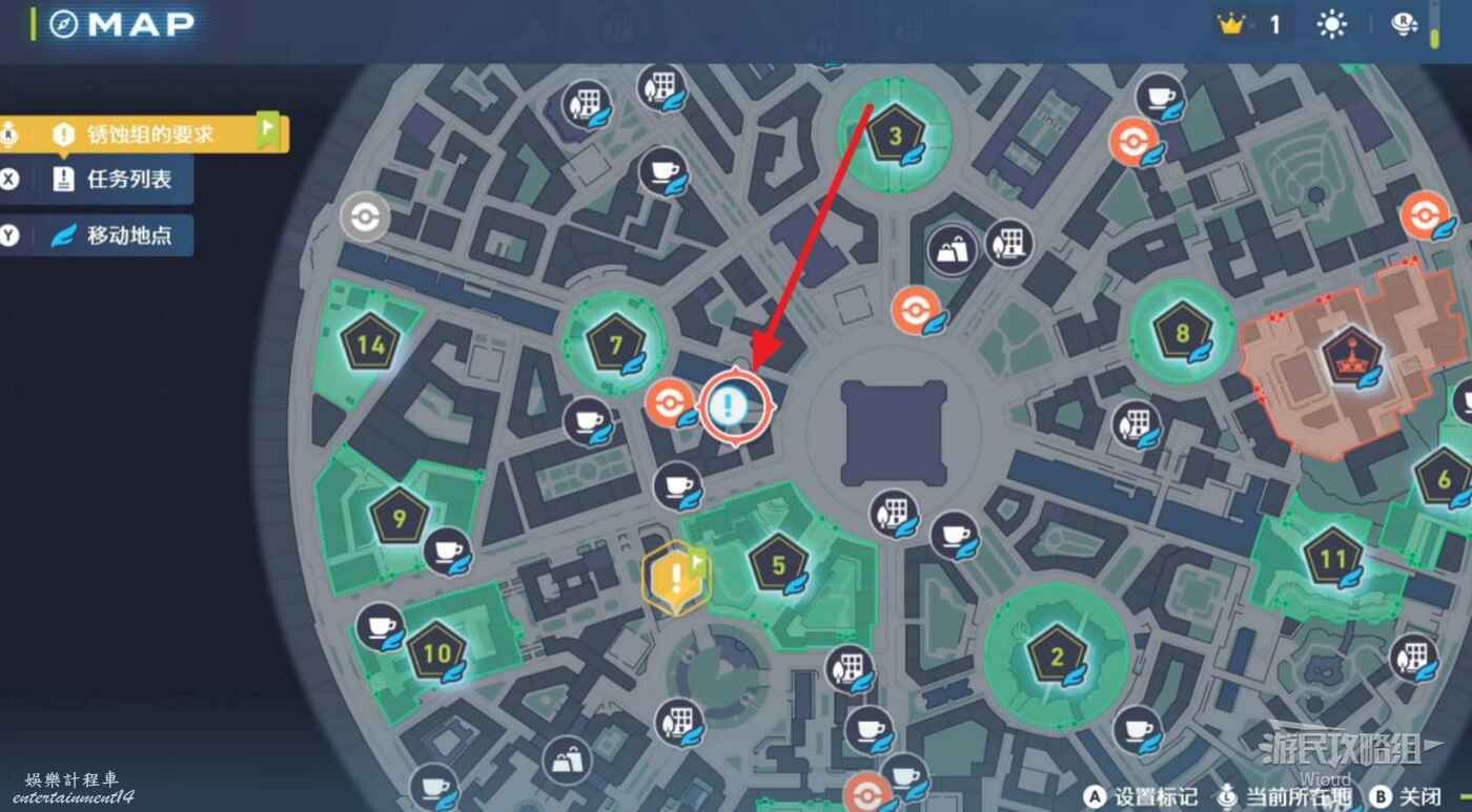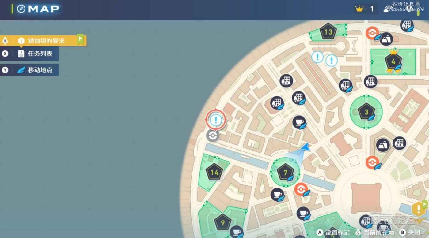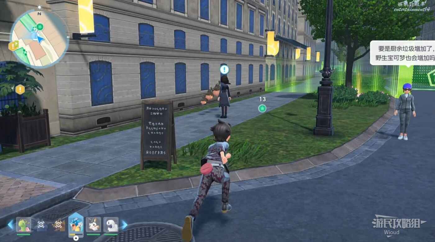 任務接取位置如下圖所示,到街道旁和發佈人對話,得知需要用招式【污泥炸彈】擊打旁邊的物體。