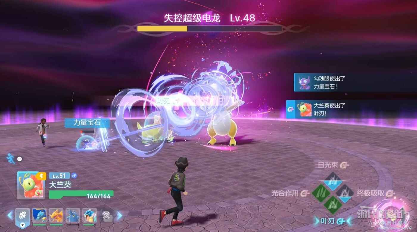 當敵人蓄力時,需要立刻收起寶可夢,敵人蓄力完成會朝玩家噴威力巨大的追蹤射線,需要圍著場景跑,直到敵人招式結束。