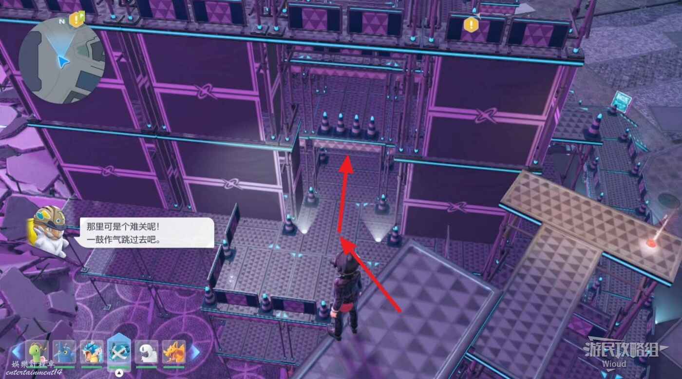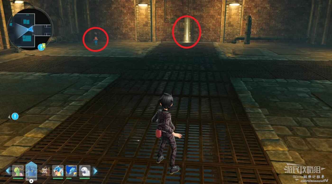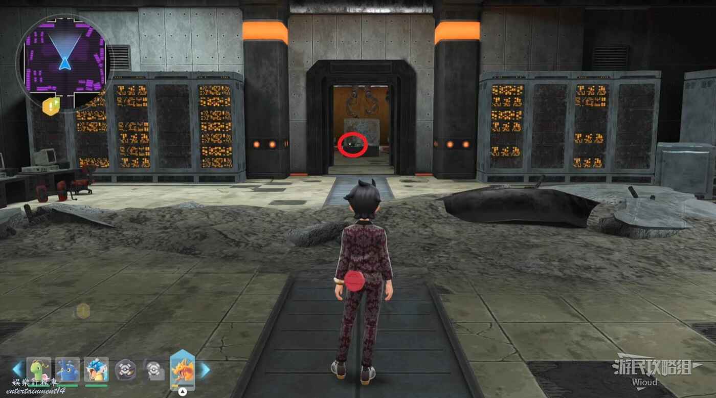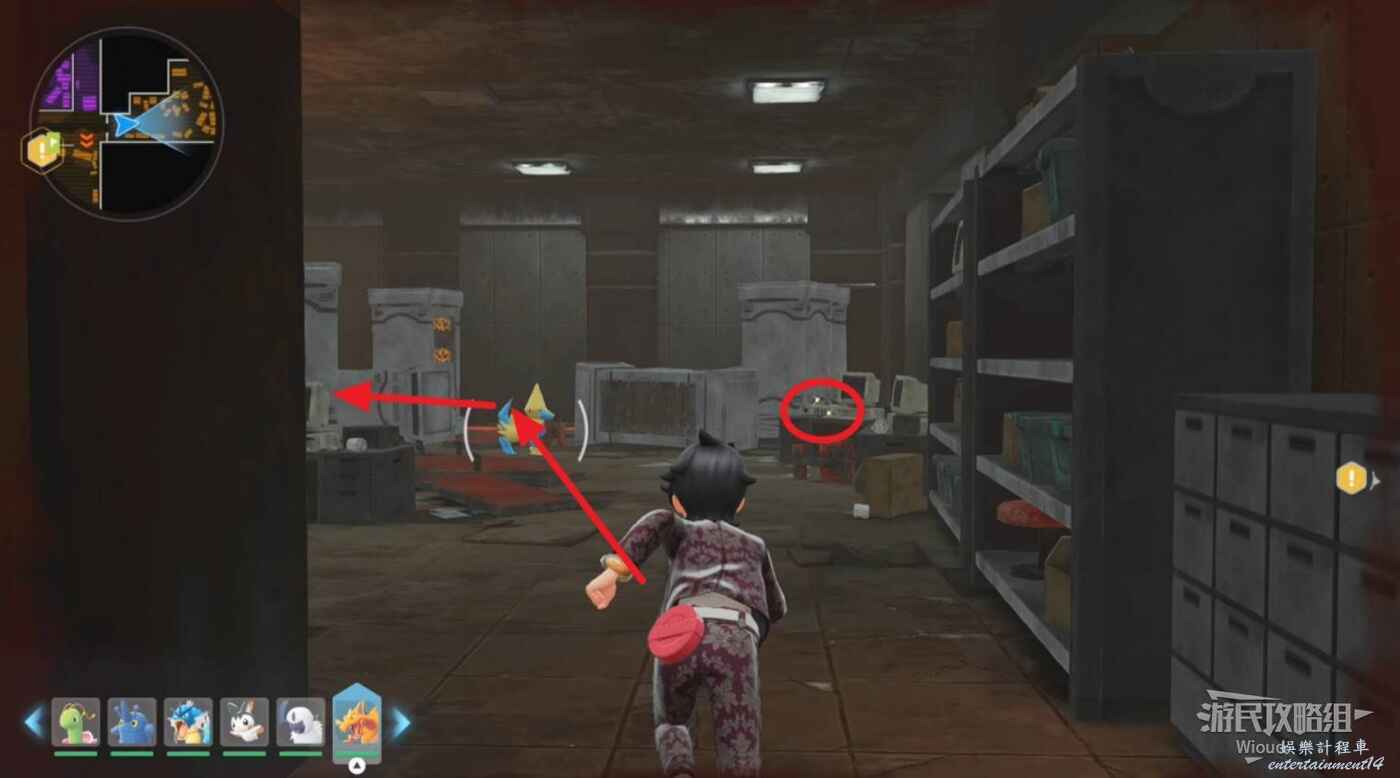 打往上走,紫色區域左側房間可抓一隻金屬怪,紅圈處打開電閘,然後移動到右側藍圈傳送到另一個房間,再用另一個傳送器到第二個房間。