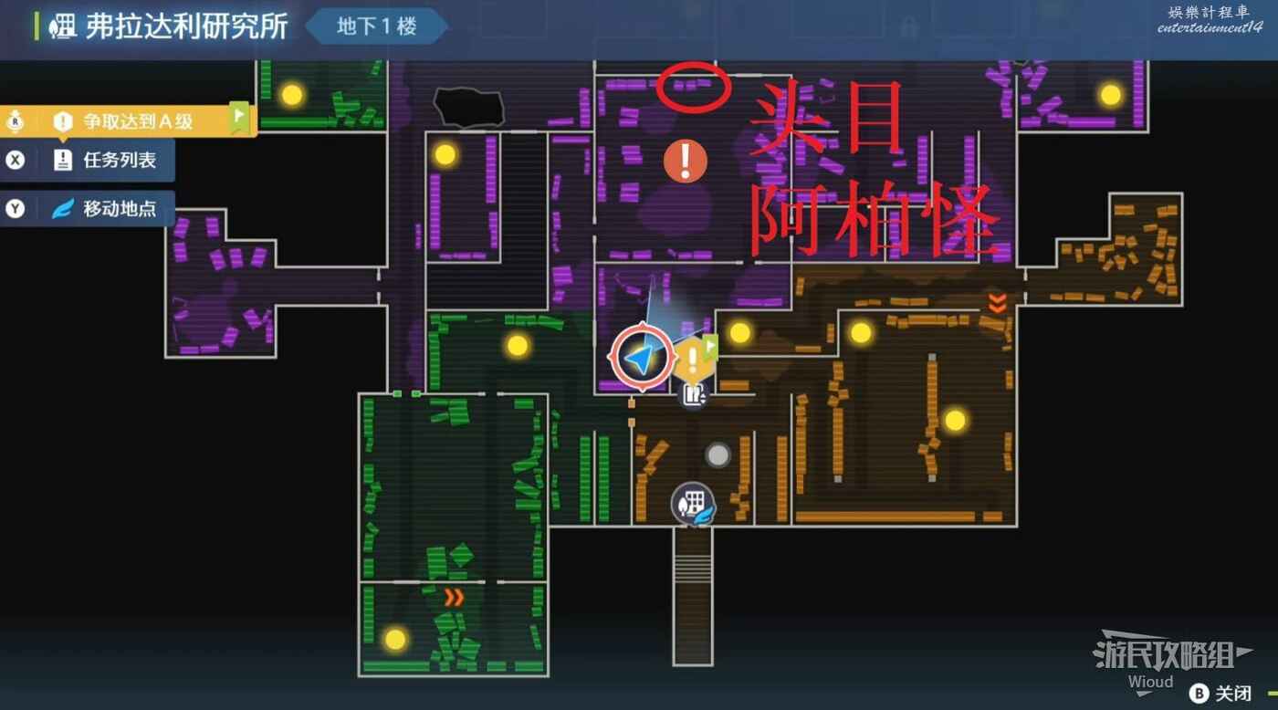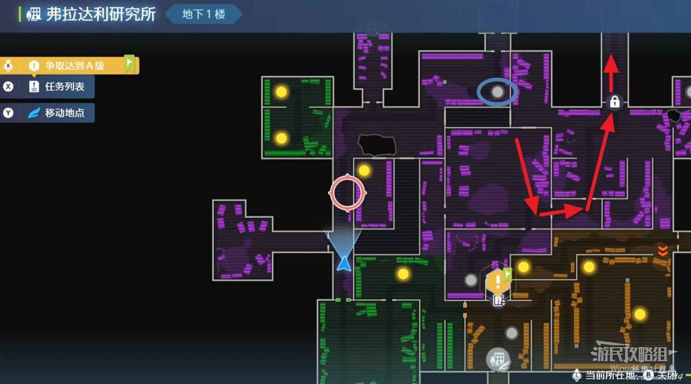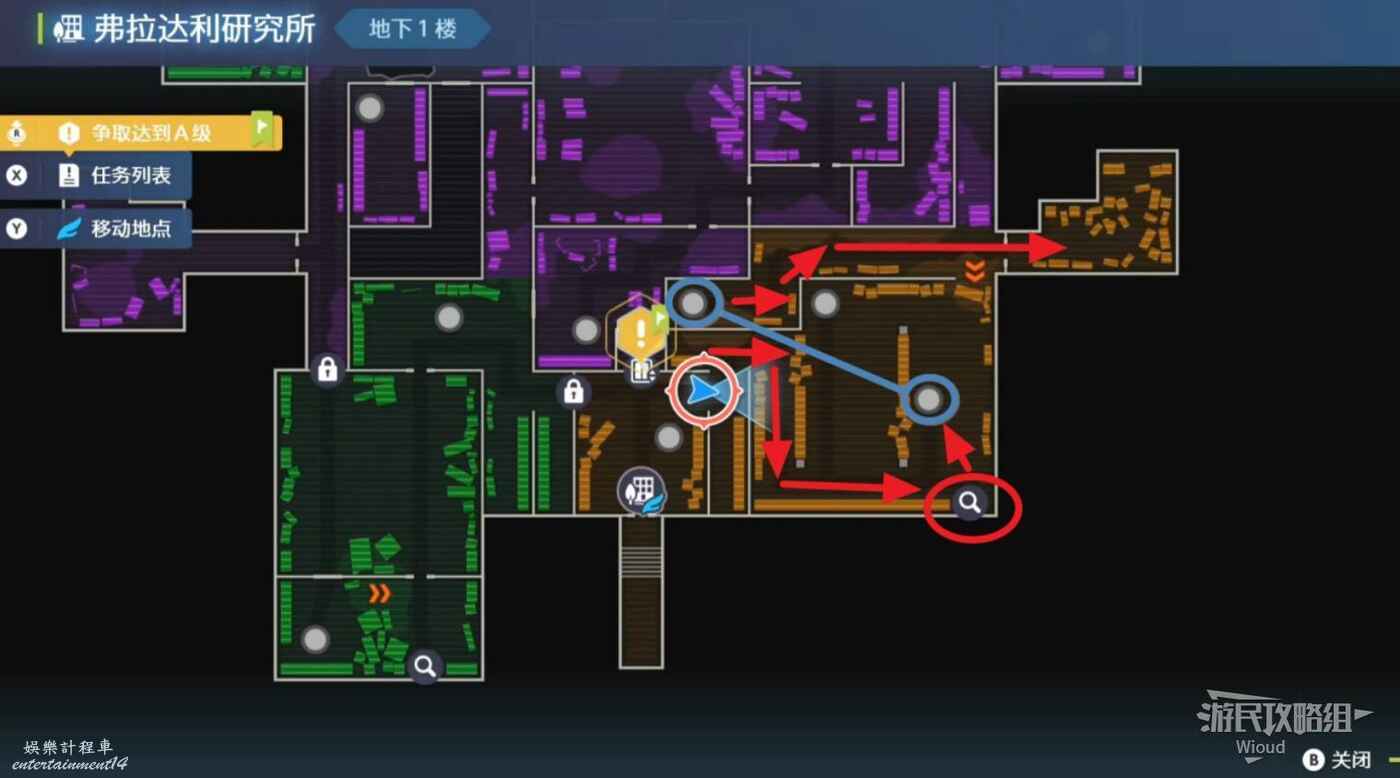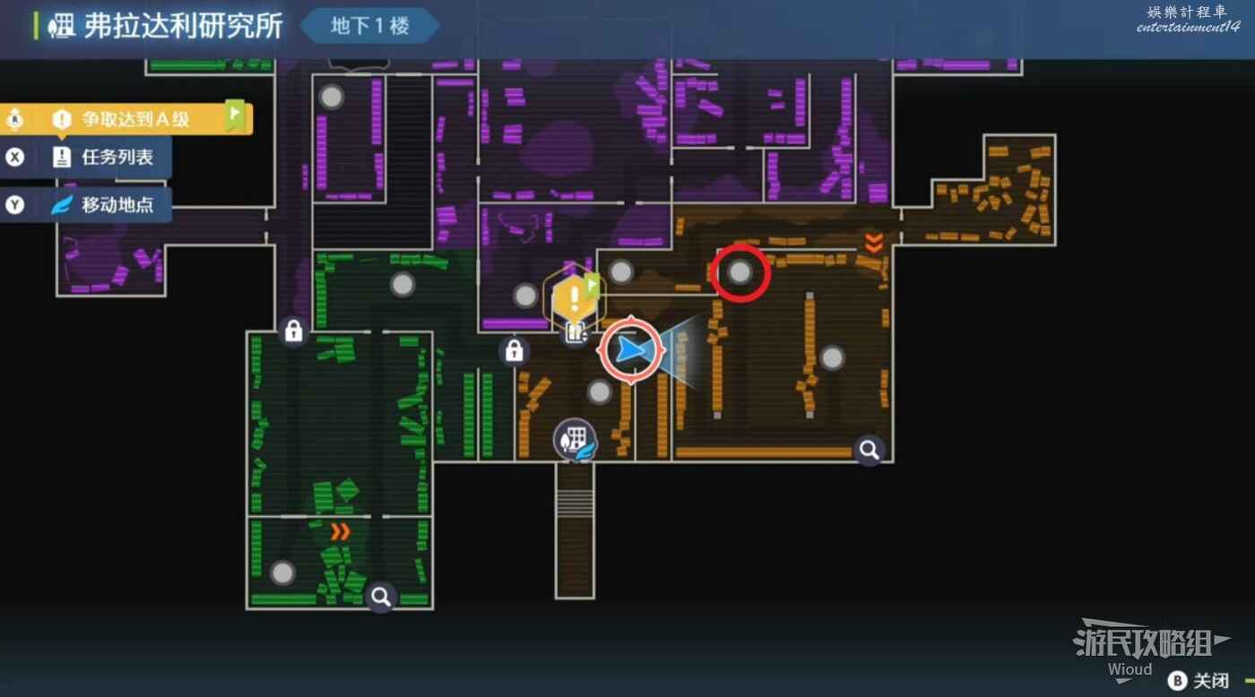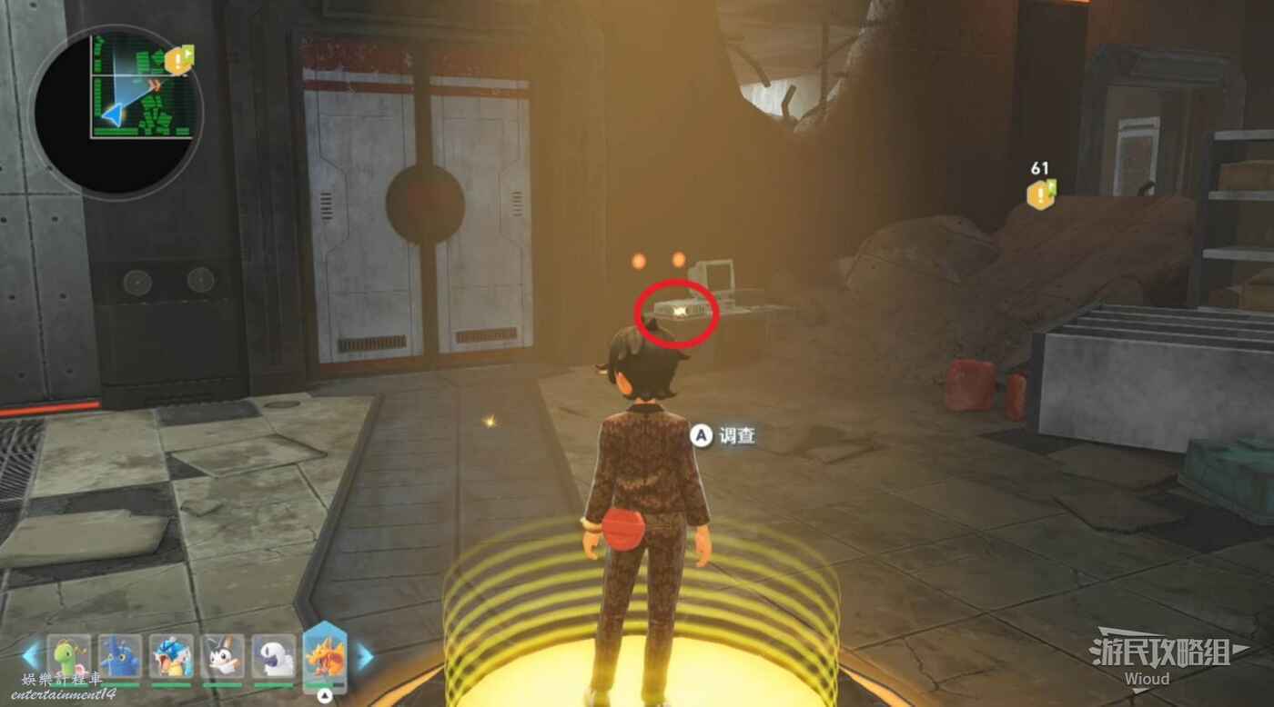 打往上走,紫色區域左側房間可抓一隻金屬怪,紅圈處打開電閘,然後移動到右側藍圈傳送到另一個房間,再用另一個傳送器到第二個房間。