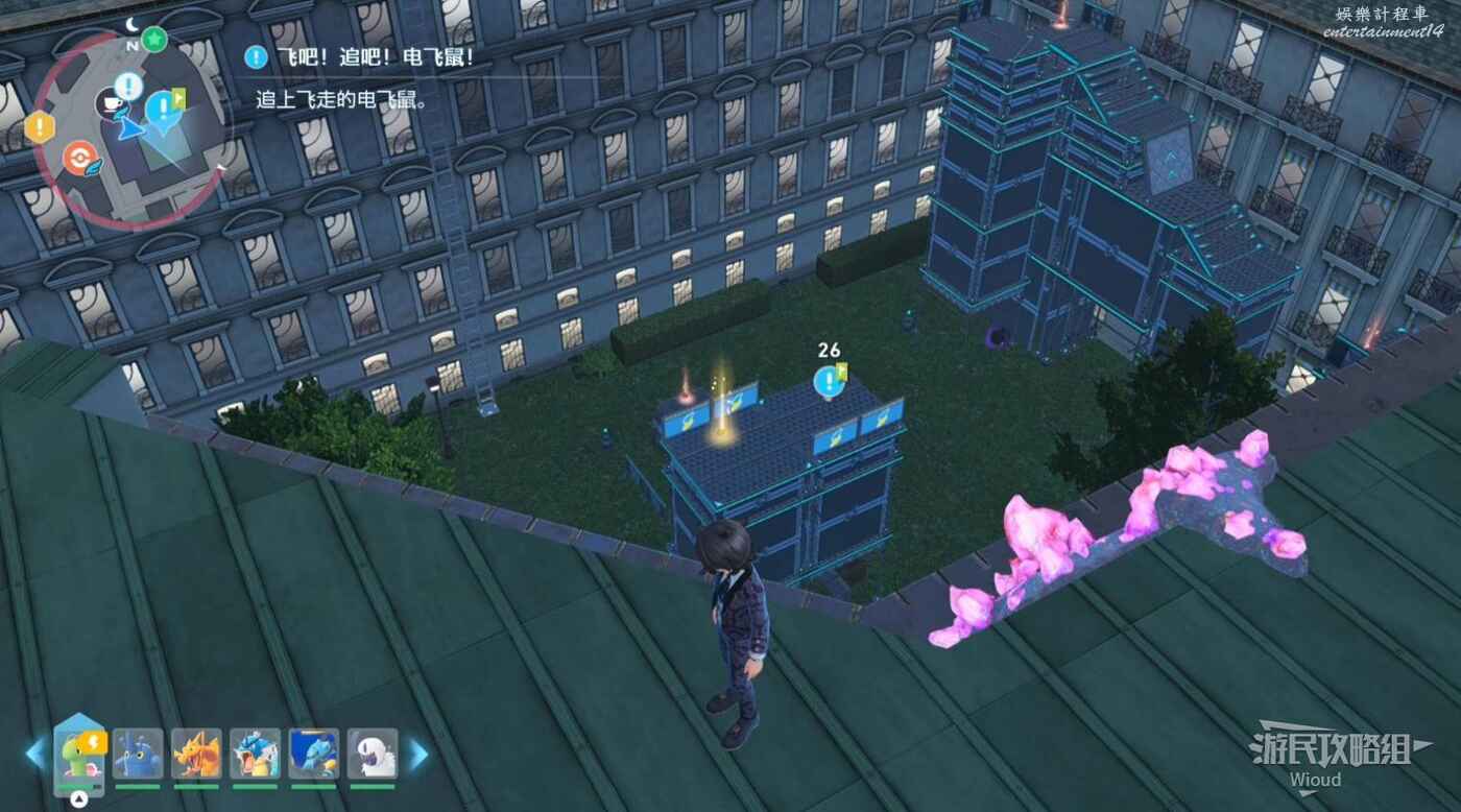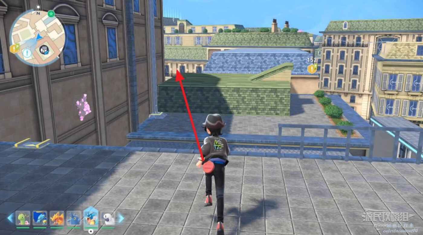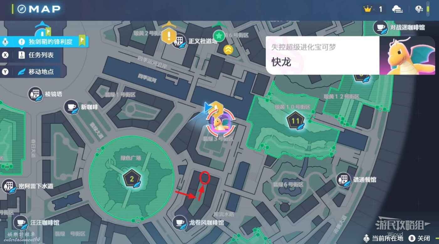 移動到地圖標識附近,注意快龍標識下方的建築,沿著紅色箭頭清楚污泥障礙進入院子,然後乘坐全息傳送梯到屋頂。