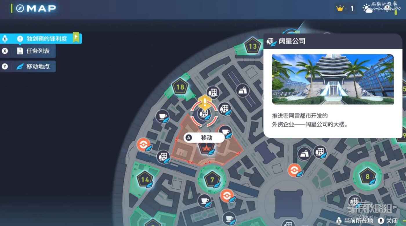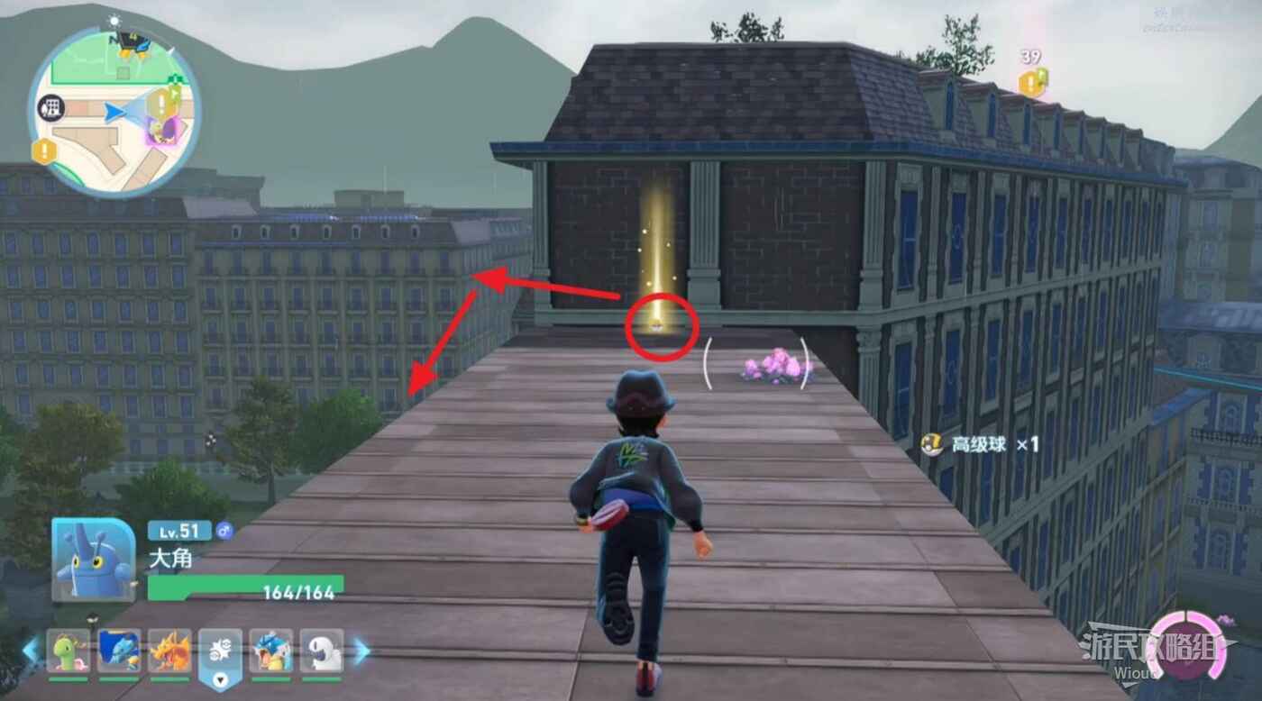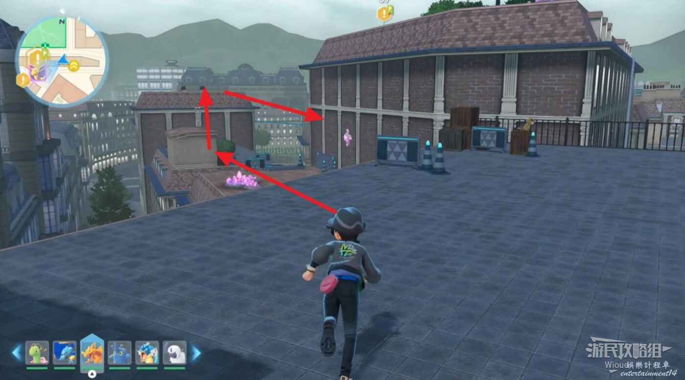 移動到地圖標識附近,注意快龍標識下方的建築,沿著紅色箭頭清楚污泥障礙進入院子,然後乘坐全息傳送梯到屋頂。