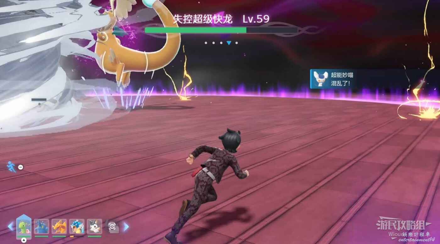 快龍有兩種蓄力方式,紫色蓄力完成時,釋放一個大型龍捲風並伴隨數個雷點觸點。