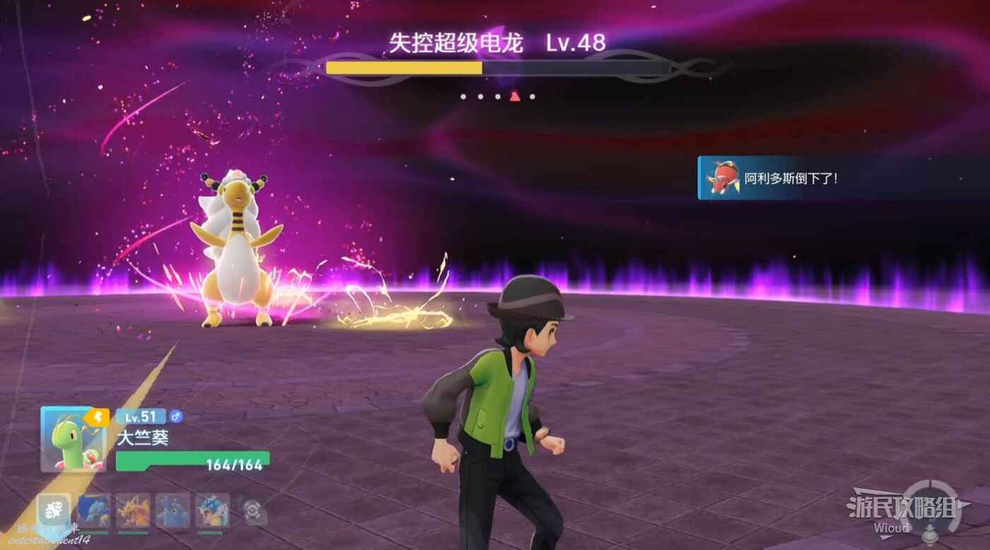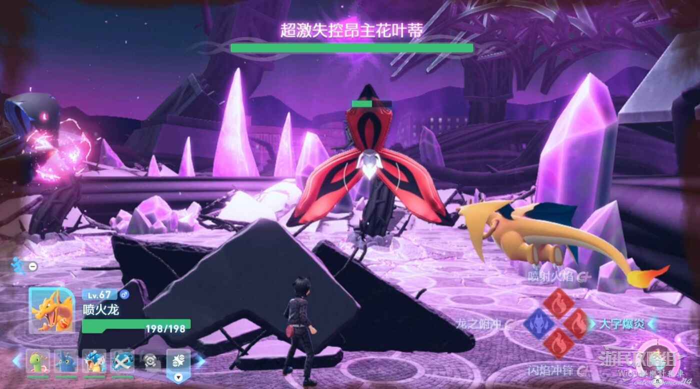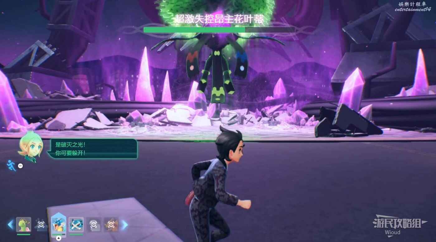 屋頂沿路走,和古曆匯合一同擊退寶可夢,不遠處找到基格爾德,傳送到超激失控昂主花葉蒂前。