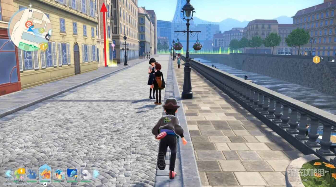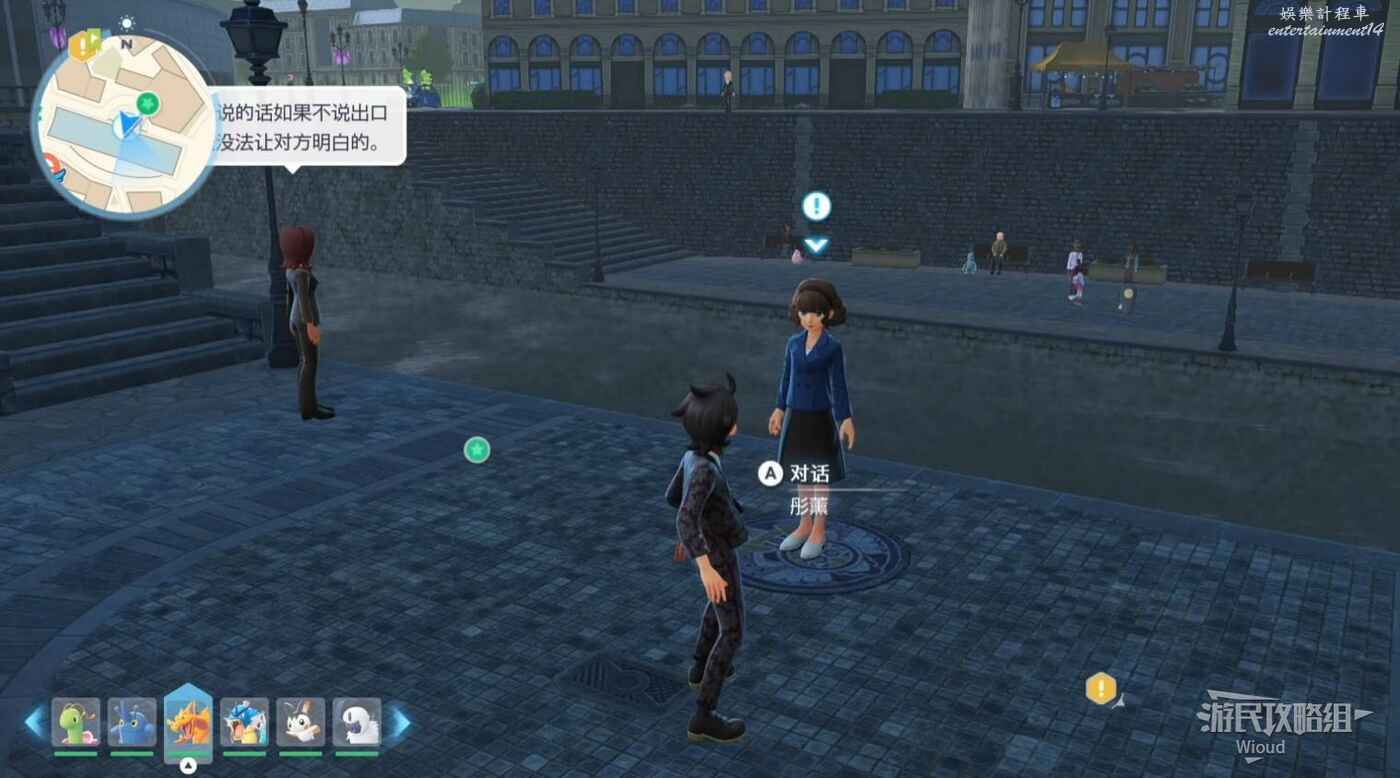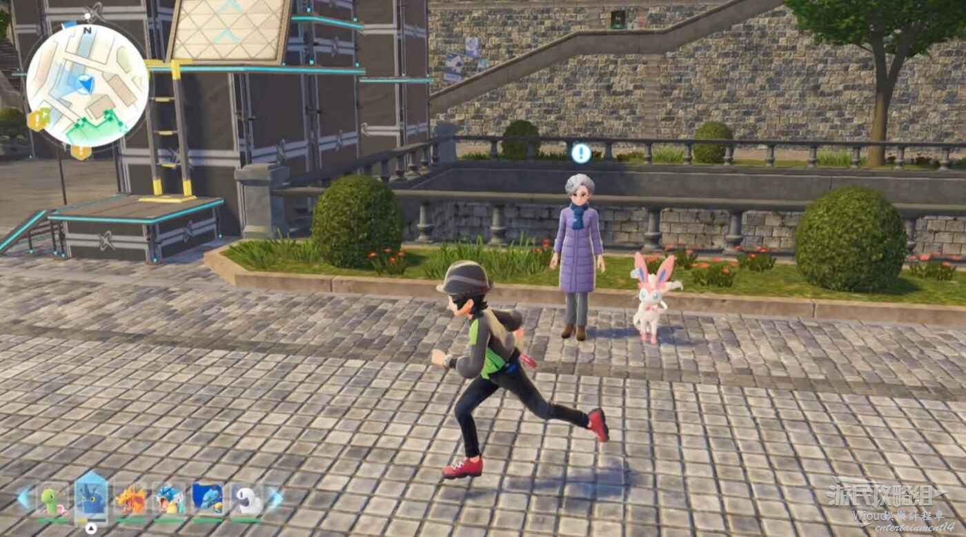 跟著皙白走一段,然後走到下一個主線指引點和卡娜莉匯合,幹掉一波來襲的寶可夢。