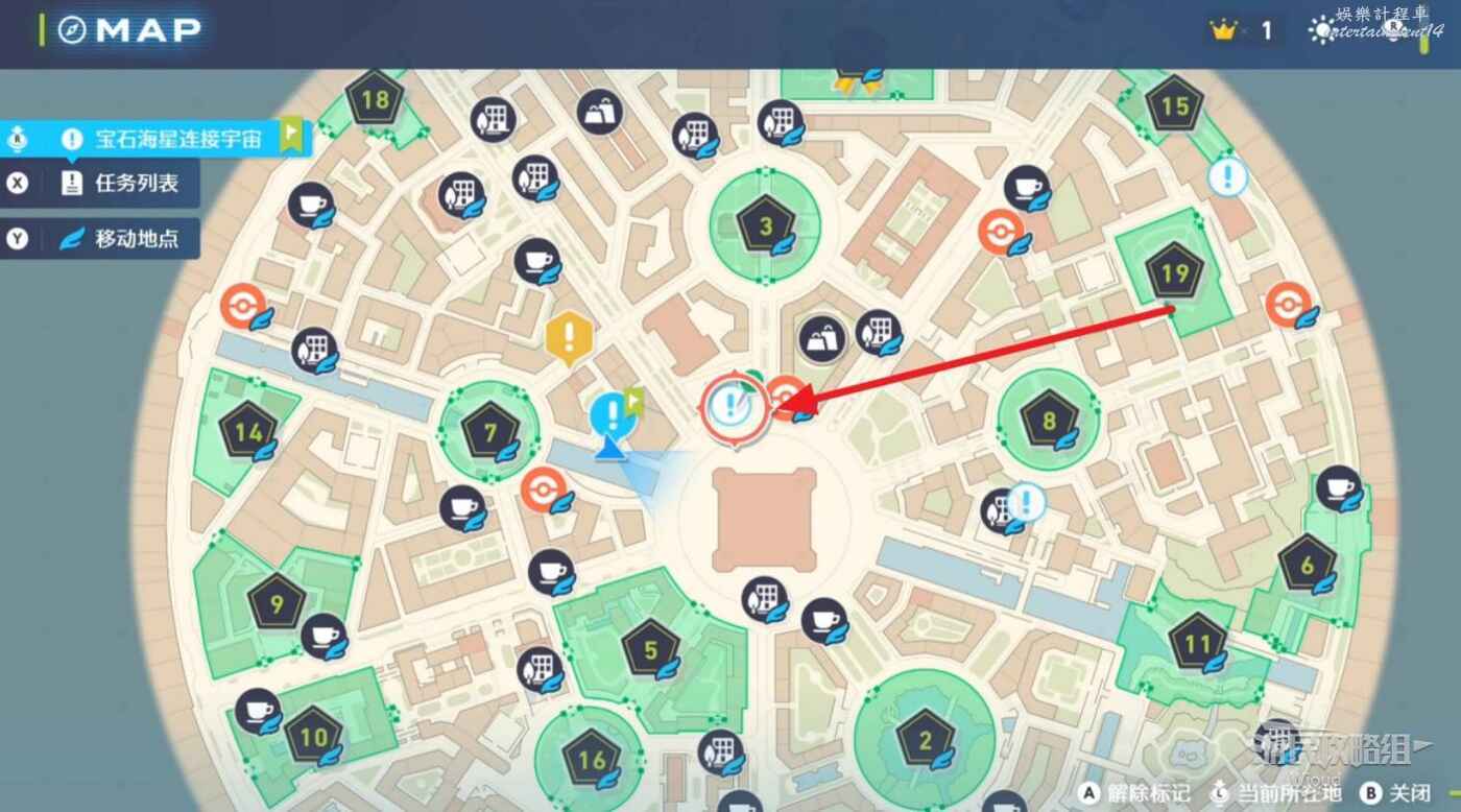 先去地圖左側的寶石海星,到附近後乘坐下圖紅圈處的全息傳送梯到屋頂。