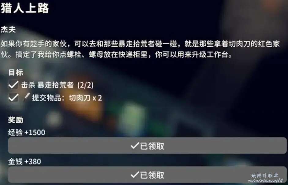 獵人上路我估計是大家會遇到的第一個暴斃點,在靠零號區左側的位置就是紅鴨子(暴走拾荒者)的營地,獵人上路任務需要我們擊殺2只,並提交固定掉落物切入刀兩把。到路口的時候基本紅鴨子就會沖過來,打它需要在近身亮紅光提示的時候翻滾,也算是一個翻滾熟練度初檢驗。
