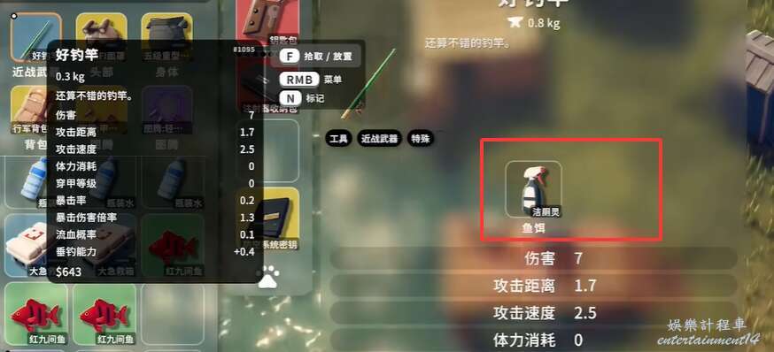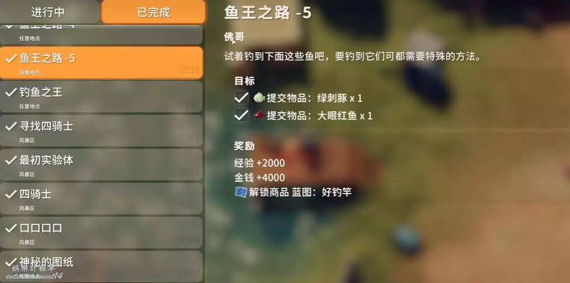逃離鴨科夫 (Escape from Duckov) 魚王之路5完成方法 25 10 月 2025-10-25 廣告 來源:互聯網 這個任務提示: 試著釣到下面這些魚吧,要釣到它們可都需要特殊的方法。 要求是提交物品:綠刺豚х1和大眼紅魚x1,那就是要去刷新兩種魚的地方釣到這兩條魚。 綠刺豚刷新點在零號區,推薦去零號區左上角碼頭釣。需要使用特殊魚餌潔廁靈。 大眼紅魚刷新點在倉庫區。需要在晴天才能釣到,且要使用特殊魚餌打火機。 完成任務,獲得獎勵經驗+2000、金錢+4000、解鎖商品藍圖:好釣竿。