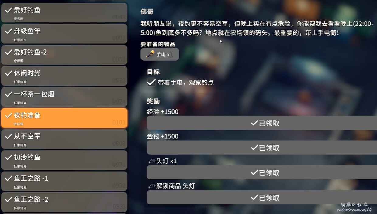 要求是帶著手電筒,觀察釣點,那麼就在拿上手電筒在規定時間裡去農場鎮的碼頭看看: