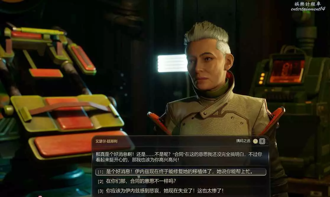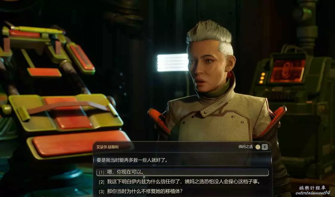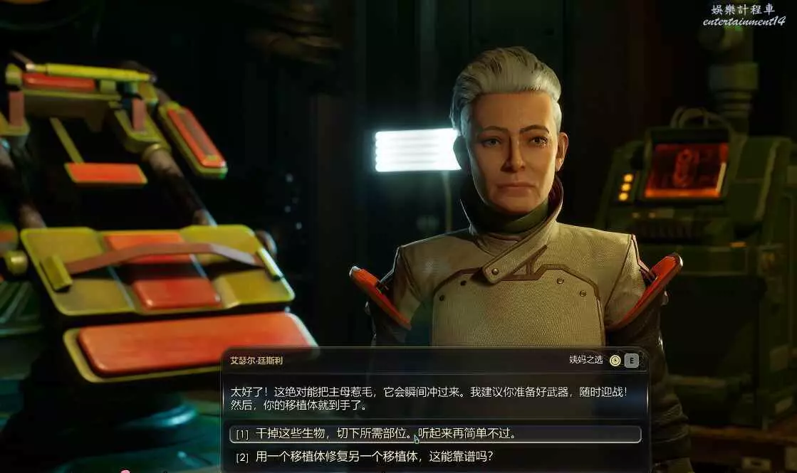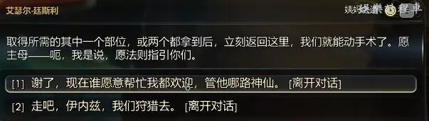 在醫生告訴了暴龍蜥母主母的移植件,並且個體都很暴躁去戰鬥力頗高的時候,不知為何伊內茲看起來很開心的樣子,這裡選擇2也可以。