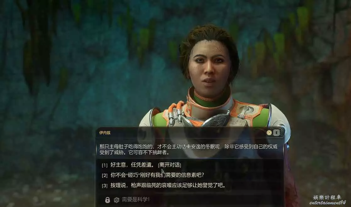 由於暴龍蜥主母一直不出來,我們要與伊內茲對話進入第二階段,讓她把可以吸引暴龍蜥的資訊素放出來