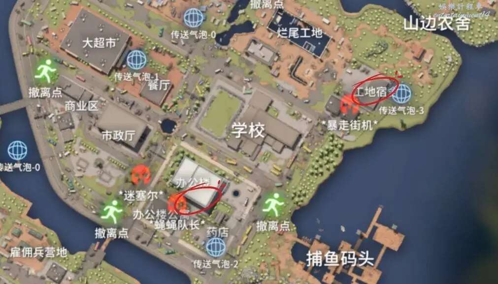 BOSS一共有兩個刷新點,分別是辦公樓和工地宿舍,位置如下圖所示。