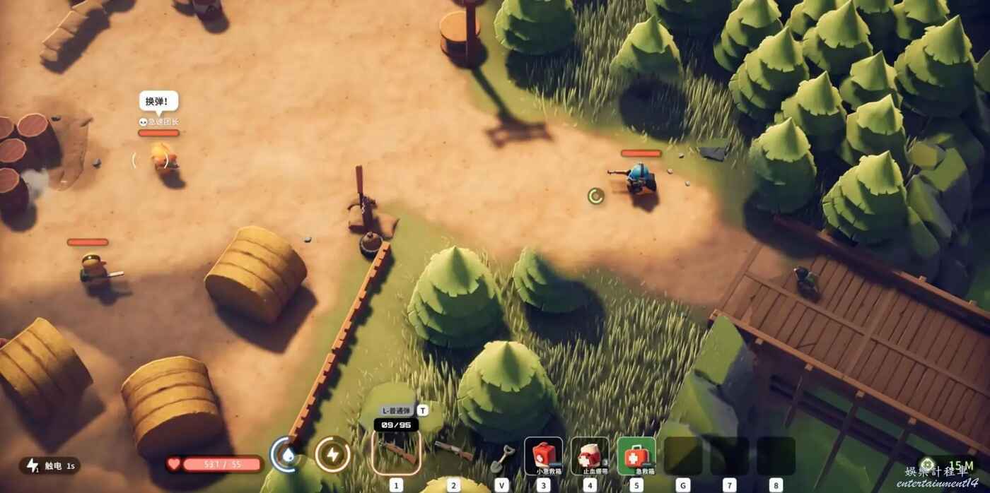 如果要強打裝備又不好,有個比較簡單的辦法,那就是伐木場右上角紫卡房,這個遊戲投擲物就是配合房子用的,你人進房子然後投擲物封門。