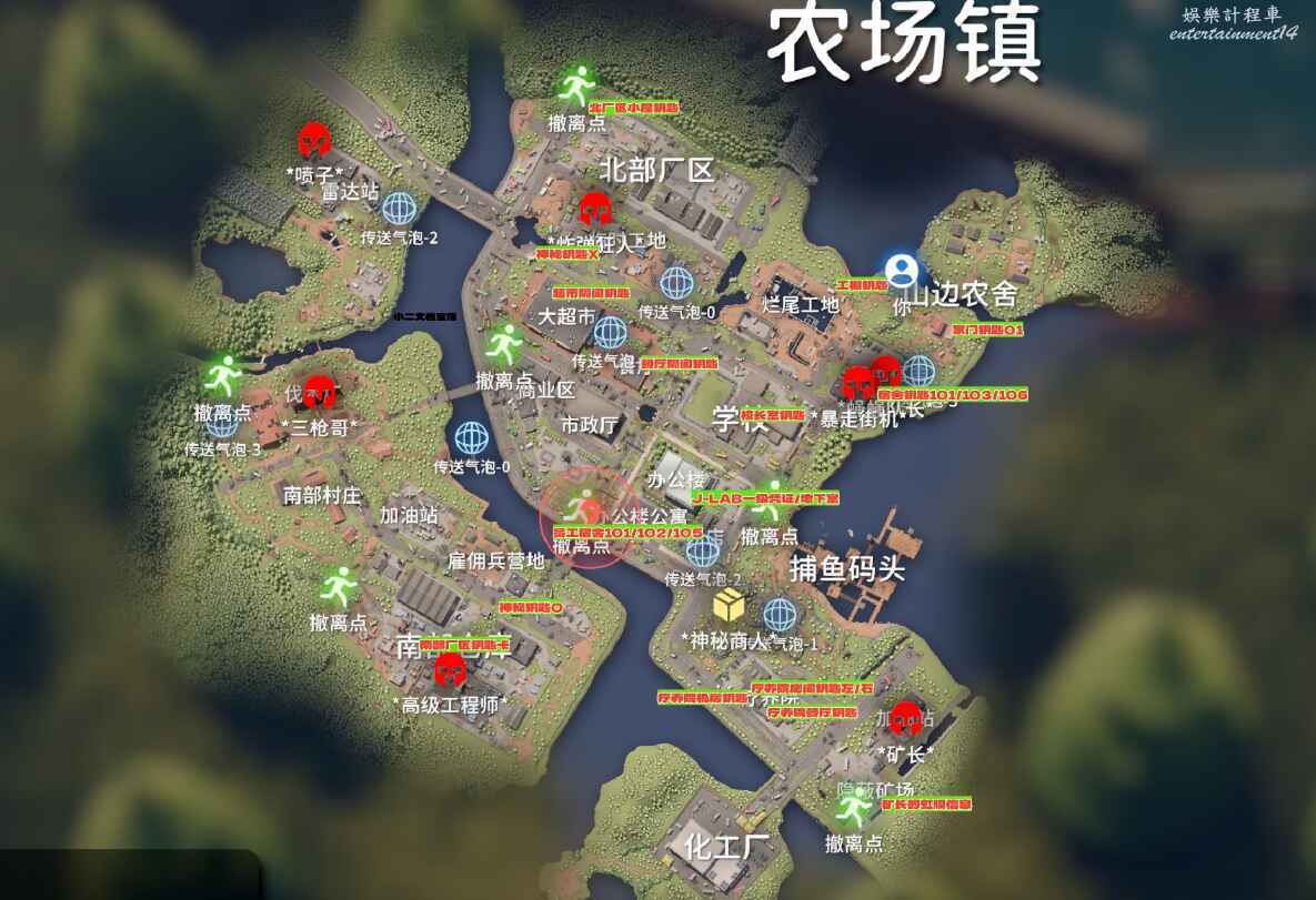 農場鎮地圖大了不少,如果沒算錯的話,應該是有21把不同的鑰匙,下面咱們挨著盤點一下。盤點順序就用自己圖中人物所在位置為起點,逆時針過一遍。