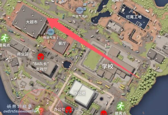 這個方案是個人在用的路線,從學校出發開完校長辦公室,到餐廳最後到大超市,基本到大超市就是超重狀態,只能滾著走那種,像貼的這張圖,如果撤離點刷在兩側,就可以選擇這種模式。