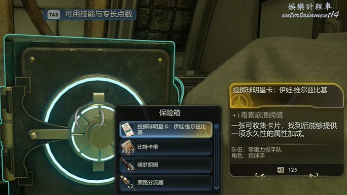 天外世界 2 伊娃維爾茲比基明星卡獲得方法 29 10 月 2025-10-29 廣告 來源:互聯網 南森勞特明星卡就在序章中收集,玩家跟著教學流程走,推進劇情到回到飛船。 跟著任務點走到飛船,然後走左手邊的房間進去,在地上拾取到指揮官保險箱鑰匙。 繼續跟著任務點走,到指揮官休息室,進去用鑰匙開啟保險櫃,裡面就能拿到伊娃維爾茲比基明星卡。 投擲球明星卡:伊娃維爾茲比基 +1毒素崩潰閥值 一張可收集卡片,找到後能夠提供一項永久性的屬性加成。