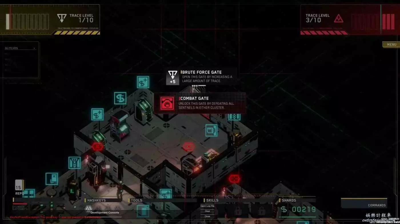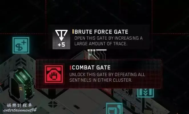 在這個例子裡,門扉解鎖的條件是“擊敗房間中所有的敵人”。你也可以“強行打開”門扉,但代價是打開這扇門扉會提升的蹤跡值翻五倍。