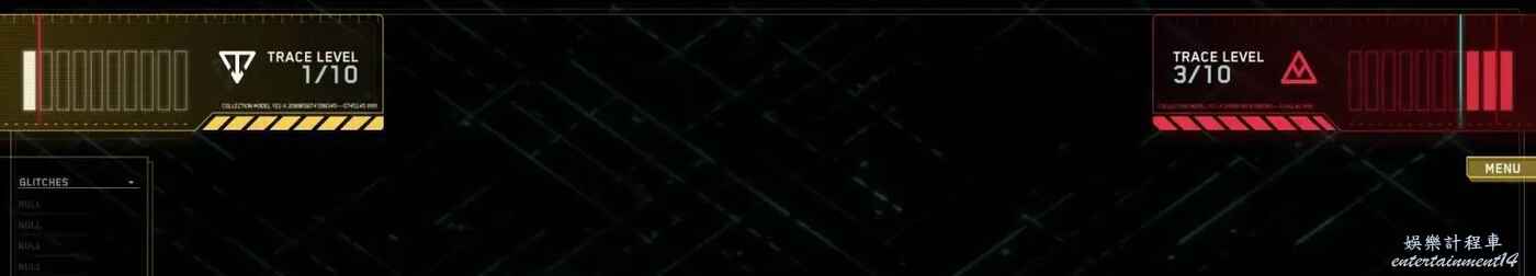 “蹤跡”(黃色計量表)每增加10級,警報級別(紅色計量表)就會增加1級。在這個例子中,玩家的“蹤跡”級別共增加了31級,因此警報級別為3級。