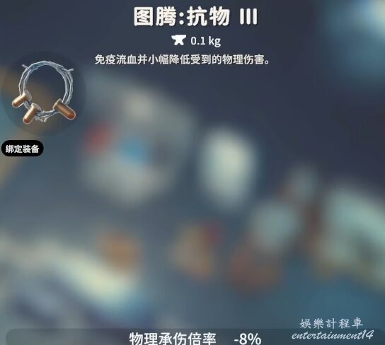 10s不受傷恢復血量,3級加速水分和能量消耗。3級加速水分能量消耗還是太麻煩了,本意是減少血包的攜帶量結果得帶更多食物,不如選2級。前期開荒如果摸到可以戴一戴。
