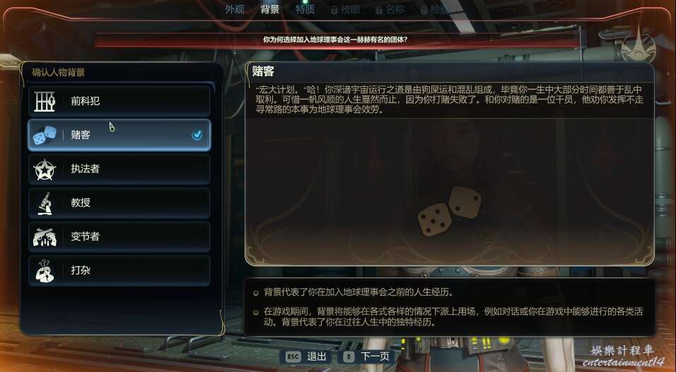前科犯:你從來都不在乎地球理事會,他們也從未把你放在心上,以至於他們認定你餘生最好都在監獄裡度過。不過,危急之下只能鋌而走險,你接受了為理事會工作的協議–或許是為了洗清案底,又或許只是趁機逃脫。