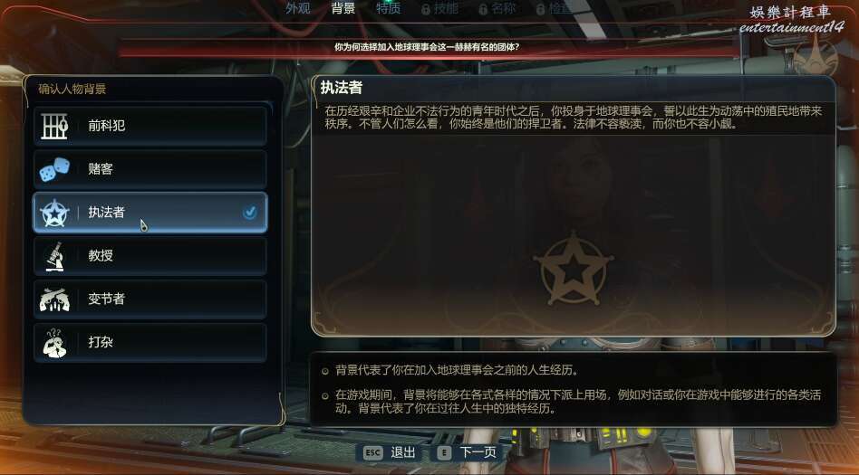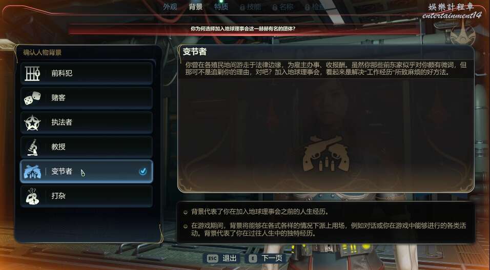 變節者:你曾在各殖民地間游走於法律邊緣,為雇主辦事、收報酬。雖然你那些前東家似乎對你頗有微詞,但那可不是逮捕你的理由,對吧?加入地球理事會,看起來是解決“工作經歷”所致麻煩的好方法。