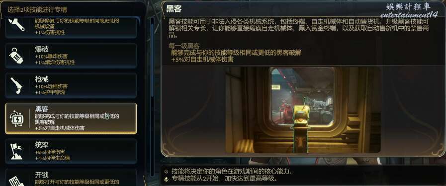 駭客:駭客技能可用於非法入侵各類機械系統,包括終端、自走機械體和自動售貨機,升級駭客技能可解鎖相關專長,讓你能夠直接癱瘓自走機械體、黑入賞金終端,以及獲取自動售貨機中的禁售商品。