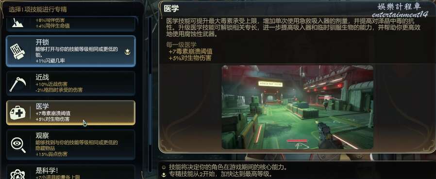 醫學:醫學技能可提升最大毒素承受上限,增加單次使用急救吸入器的劑量,並提高對澤晶中毒的抗性。升級醫學技能可解鎖相關專長,進一步提高吸入器和臨時馴服生物的能力,並幫助你更高效地使用腐蝕性武器。